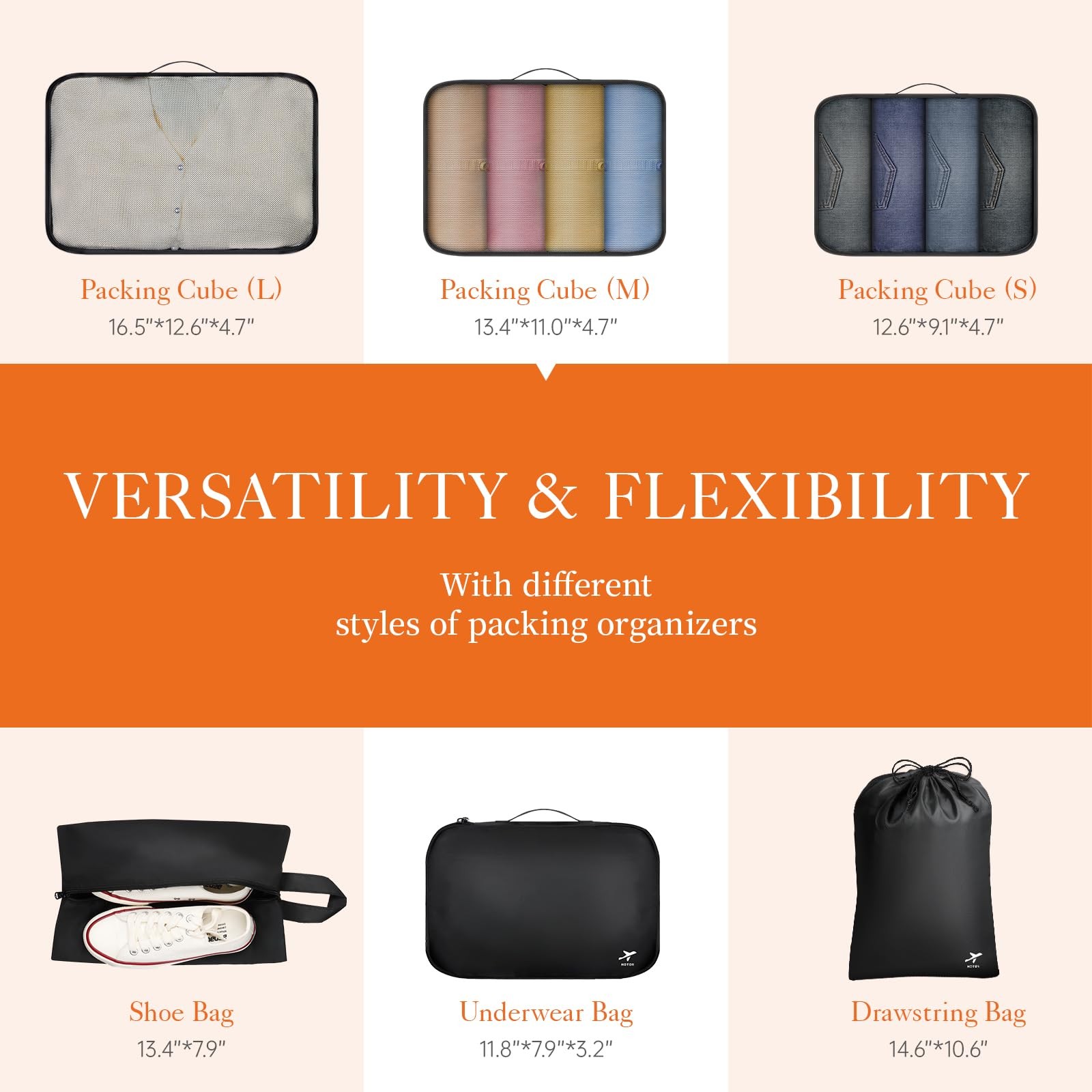 GET YOUR LUGGAGE WELL-ORGANIZED: With 6-piece travel packing organizers, packing is no more a chore for traveling. Just one set is enough for organizing all your travel essentials like clothes, shoes, underwear, and more, making your luggage neat and shipshape. They are not only cruise ship essentials but also ideal for every occasion, like family breaks, business travels, vacations, hiking, camping, RV trips, etc. VERSATILE & FLEXIBLE: travel cubes for packing feature 6 different sizes and styles of organizers for different items: 3 mesh bags, 1 shoe bag, 1 drawstring pocket, and 1 underwear bag. Moreover, these packing cubes can be used to stay organized at home, while traveling, and are perfect for camping or any outdoor adventure! You can easily fit them into your suitcases, totes, backpacks, duffel bag, etc. LIGHTWEIGHT & SPACE-SAVING: With the help of travel bags, you can maximize the space in the luggage, creating space for other stuff. In addition, the travel organizer bags for luggage are easy to store and carry. They are collapsible and can be folded flat when not in use. The 6-piece set weighs less than 1.0lb and won't add extra weight to your luggage. NEVER FORGET THE ESSENTIALS: Before using these packing cubes for carry-on suitcases, have you often forgotten one or two of your essentials with you when going out? Now it's time to say goodbye to carelessness! Let packing cubes help you to sort out all the travel must-haves and contain them in order! PREMIUM QUALITY: Featuring high-density and water-resistant fabric, these travel organizer bags for luggage can protect your clothes from wrinkles, stains, and moisture. On top of that, be rest assured that the metal zippers are built to last with frequent use. The widened 5mm two-way zippers slide smoothly without any jamming and snags.