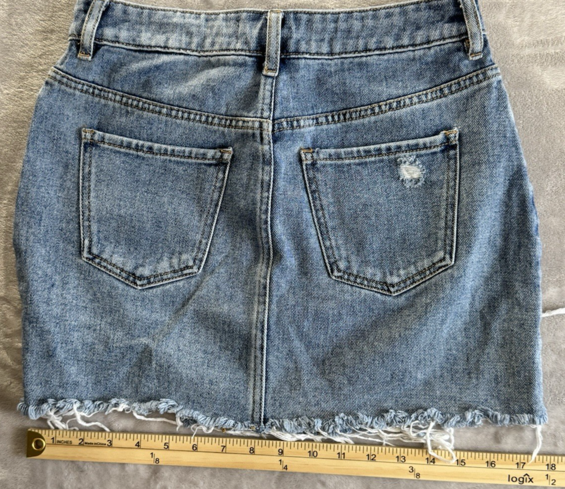 Elevate your casual denim look with this chic PacSun denim mini skirt. The frayed raw hem adds a trendy touch to the classic blue denim skirt. Perfect for a day out, this skirt features a zip closure, pockets and button accents for added style. Made of high-quality cotton, this denim mini skirt is a must-have for your wardrobe. The skirt is available in size 24 and is suitable for regular size types.
