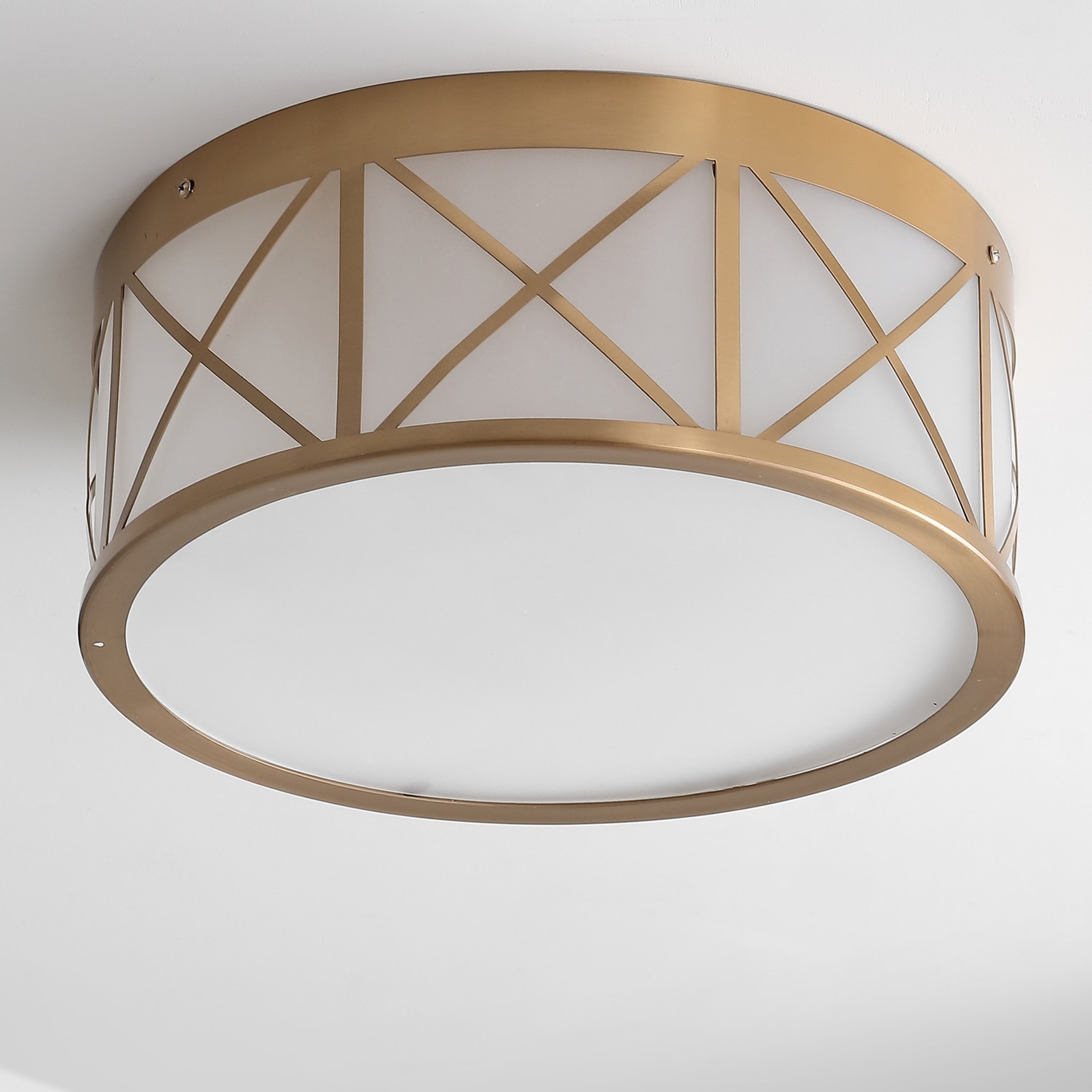 Update your kitchen or breakfast nook with this charming flush mount light. This light's drum shape and warm goldtone finish make it an ideal complement for transitional or mid-century decor, while its sleek, low silhouette makes it a natural finish for low ceilings or small rooms. Frosted diffuser panels help soften the light for a gentle, glare-free glow that's perfect for dining or conversation. Equipped with an LED bulb for cool, energy-efficient illumination, this versatile fixture is compatible with CFL or 40-watt bulbs. Features:Perfect for low ceilings, the 6.5" height fits just about anywhereThe modern gold-brass finish adds an elegant touchEco-friendly 9W LED bulb includedTakes 2 bulbs and compatible with any 9W LED or 40W TYPE "A" or 13W CFLAs this fixture must be hardwired, we Free Shipping Over $49.99* Details Pagoda 13" Drum Metal/Glass Flush Mount Brass Gold by JONATHAN Y Product Description: Update your kitchen or breakfast nook with this charming flush mount light. This light's drum shape and warm goldtone finish make it an ideal complement for transitional or mid-century decor, while its sleek, low silhouette makes it a natural finish for low ceilings or small rooms. Frosted diffuser panels help soften the light for a gentle, glare-free glow that's perfect for dining or conversation. Equipped with an LED bulb for cool, energy-efficient illumination, this versatile fixture is compatible with CFL or 40-watt bulbs. Features: Perfect for low ceilings, the 6.5" height fits just about anywhere The modern gold-brass finish adds an elegant touch Eco-friendly 9W LED bulb included Takes 2 bulbs and compatible with any 9W LED or 40W TYPE "A" or 13W CFL As this fixture must be hardwired, we recommend a professional electrician manage installation ColorBrass Gold/White Body MaterialMetal/Glass IncludesOne (1) lamp Assembly Required Dimensions: Lamp6.5 inches high x 13 inches wide x 13 inches deep About us: You see a lamp.We see a decorative work of art.A perfectly curved shade casts a dramatic shadow on a floor. Compatible with LED lightbulbsas easy on the environment as they are on the eyes. The JONATHAN Y Lighting collection considers every detail from impeccably sourced materials to designer styling. And our prices are so attractive, we've transformed a functional necessity into a fashion accessory.JONATHAN Y Lighting - a fashion revolution in home decor