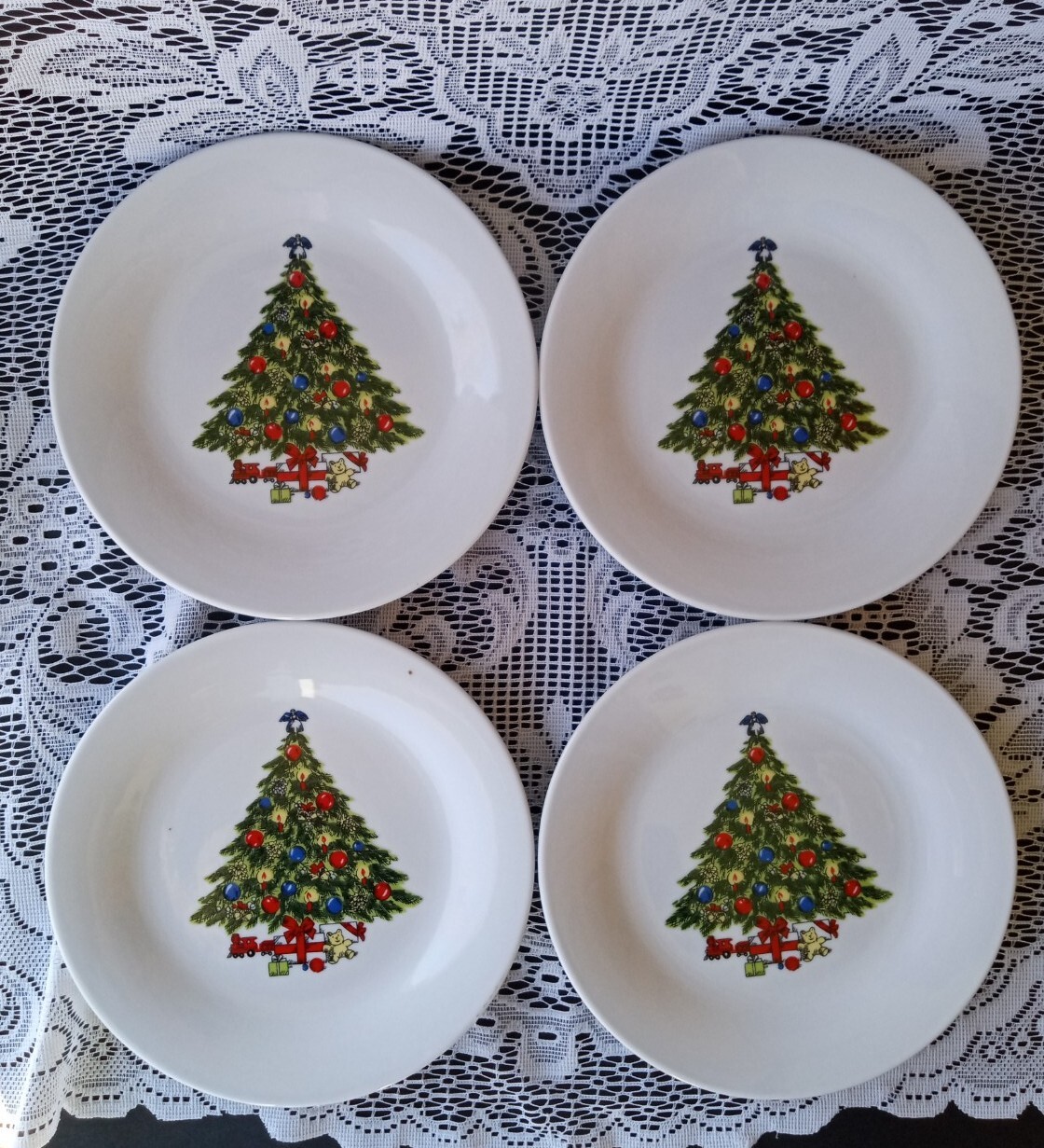 Pagoda Liling China Christmas Tree Salad Plates Set of 4 Christmas Tree with presents pattern Set of 4 Each measures approximately 7 1/2" diameter Each weighs about 11 oz Overall these are in very good condition. One of the plates appear to have a couple of manufacturing blemishes (please see pictures). There are no chips or cracks detected. Packed with Care and Ready to Ship