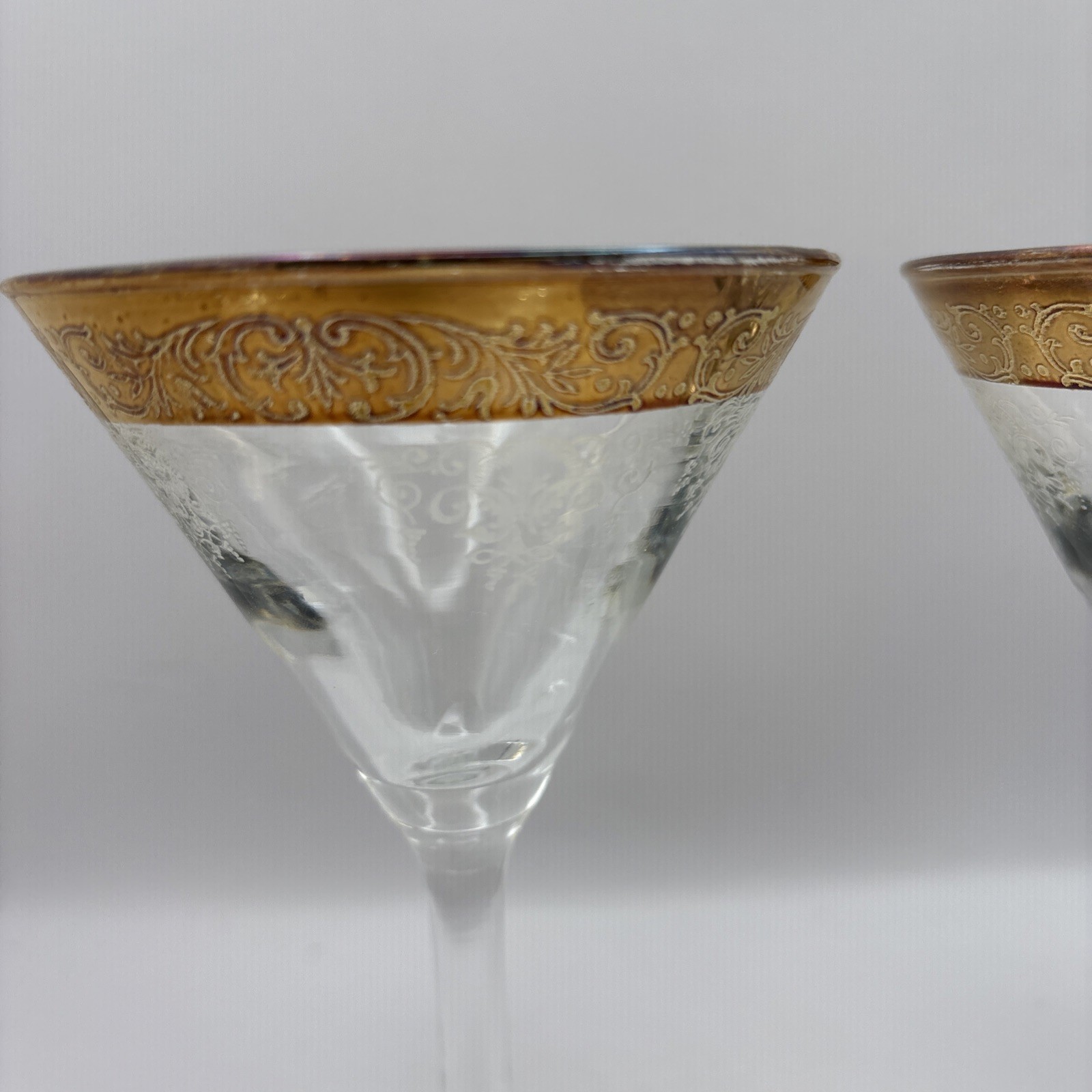 This is a pair of Cellini Crystal champagne glasses decorated with 24 karat gold. Please note there is some gold loss. Made In Italy
