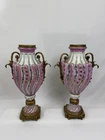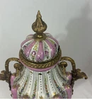 Pair of Large Antique French Sèvres-Style Porcelain & Bronze Lidded Vases – Late 19th / Early 20th Century This is a stunning pair of large French Sèvres-style porcelain vases, dating from the late 19th to early 20th century. Each vase features an elegant fluted form with alternating white and pink panels, richly decorated with delicate gilt scrollwork and floral motifs in the classic Sèvres tradition. The vases are beautifully mounted with gilt bronze (ormolu), including two ornate handles, base and lids topped with decorative finials. Dimensions: Height: 29 in. Width: 15 in. Depth: 10 in. Condition: Good vintage condition with wear consistent with their history. Please review all photos carefully, as they form an important part of the description. Ships exactly as shown in the photos. Please feel free to contact me with any questions or to request additional images.