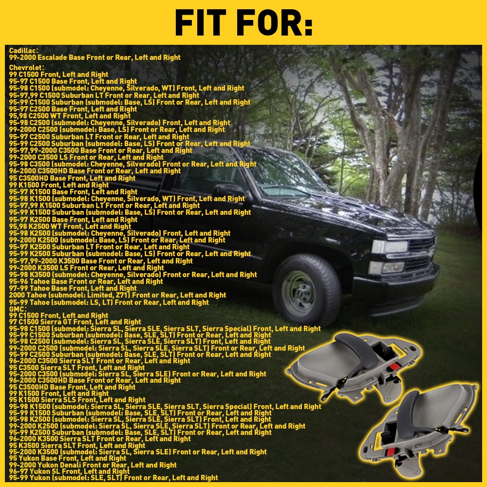 NEW Right Left Interior Door Handle Fit For Cadillac,Chevrolet,GMC etc. Fit for: Cadillac: 99-2000 Escalade Base Front or Rear, Left and Right Chevrolet: 99 C1500 Front, Left and Right 95-97 C1500 Base Front, Left and Right 95-98 C1500 (submodel: Cheyenne, Silverado, WT) Front, Left and Right 95-97,99 C1500 Suburban LT Front or Rear, Left and Right 95-99 C1500 Suburban (submodel: Base, LS) Front or Rear, Left and Right 95-97 C2500 Base Front, Left and Right 95,98 C2500 WT Front, Left and Right 95-98 C2500 (submodel: Cheyenne, Silverado) Front, Left and Right Pair Front Interior Door Handle For 1995-99 C1500 Chevrolet Gray Inside 15708044 NEW Right Left Interior Door Handle Fit For Cadillac,Chevrolet,GMC etc. Fit for: Cadillac: 99-2000 Escalade Base Front or Rear, Left and Right Chevrolet: 99 C1500 Front, Left and Right 95-97 C1500 Base Front, Left and Right 95-98 C1500 (submodel: Cheyenne, Silverado, WT) Front, Left and Right 95-97,99 C1500 Suburban LT Front or Rear, Left and Right 95-99 C1500 Suburban (submodel: Base, LS) Front or Rear, Left and Right 95-97 C2500 Base Front, Left and Right 95,98 C2500 WT Front, Left and Right 95-98 C2500 (submodel: Cheyenne, Silverado) Front, Left and Right 99-2000 C2500 (submodel: Base, LS) Front or Rear, Left and Right 95-97 C2500 Suburban LT Front or Rear, Left and Right 95-99 C2500 Suburban (submodel: Base, LS) Front or Rear, Left and Right 95-97,99-2000 C3500 Base Front or Rear, Left and Right 99-2000 C3500 LS Front or Rear, Left and Right 95-98 C3500 (submodel: Cheyenne, Silverado) Front or Rear, Left and Right 96-2000 C3500HD Base Front or Rear, Left and Right 95 C3500HD Base Front, Left and Right 99 K1500 Front, Left and Right 95-97 K1500 Base Front, Left and Right 95-98 K1500 (submodel: Cheyenne, Silverado, WT) Front, Left and Right 95-97,99 K1500 Suburban LT Front or Rear, Left and Right 95-99 K1500 Suburban (submodel: Base, LS) Front or Rear, Left and Right 95-97 K2500 Base Front, Left and Right 95,98 K2500 WT Front, Left and Right 95-98 K2500 (submodel: Cheyenne, Silverado) Front, Left and Right 99-2000 K2500 (submodel: Base, LS) Front or Rear, Left and Right 95-97 K2500 Suburban LT Front or Rear, Left and Right 95-99 K2500 Suburban (submodel: Base, LS) Front or Rear, Left and Right 95-97,99-2000 K3500 Base Front or Rear, Left and Right 99-2000 K3500 LS Front or Rear, Left and Right 95-98 K3500 (submodel: Cheyenne, Silverado) Front or Rear, Left and Right 95-96 Tahoe Base Front or Rear, Left and Right 97-99 Tahoe Base Front, Left and Right 2000 Tahoe (submodel: Limited, Z71) Front or Rear, Left and Right 95-99 Tahoe (submodel: LS, LT) Front or Rear, Left and Right GMC: 99 C1500 Front, Left and Right 97 C1500 Sierra GT Front, Left and Right 95-98 C1500 (submodel: Sierra SL, Sierra SLE, Sierra SLT, Sierra Special) Front, Left and Right 95-99 C1500 Suburban (submodel: Base, SLE, SLT) Front or Rear, Left and Right 95-98 C2500 (submodel: Sierra SL, Sierra SLE, Sierra SLT) Front, Left and Right 99-2000 C2500 (submodel: Sierra SL, Sierra SLE, Sierra SLT) Front or Rear, Left and Right 95-99 C2500 Suburban (submodel: Base, SLE, SLT) Front or Rear, Left and Right 96-2000 C3500 Sierra SLT Front or Rear, Left and Right 95 C3500 Sierra SLT Front, Left and Right 95-2000 C3500 (submodel: Sierra SL, Sierra SLE) Front or Rear, Left and Right 96-2000 C3500HD Base Front or Rear, Left and Right 95 C3500HD Base Front, Left and Right 99 K1500 Front, Left and Right 95 K1500 Sierra SLS Front, Left and Right 95-98 K1500 (submodel: Sierra SL, Sierra SLE, Sierra SLT, Sierra Special) Front, Left and Right 95-99 K1500 Suburban (submodel: Base, SLE, SLT) Front or Rear, Left and Right 95-98 K2500 (submodel: Sierra SL, Sierra SLE, Sierra SLT) Front, Left and Right 99-2000 K2500 (submodel: Sierra SL, Sierra SLE, Sierra SLT) Front or Rear, Left and Right 95-99 K2500 Suburban (submodel: Base, SLE, SLT) Front or Rear, Left and Right 96-2000 K3500 Sierra SLT Front or Rear, Left and Right 95 K3500 Sierra SLT Front, Left and Right 95-2000 K3500 (submodel: Sierra SL, Sierra SLE) Front or Rear, Left and Right 95 Yukon Base Front, Left and Right 99-2000 Yukon Denali Front or Rear, Left and Right 96-97 Yukon SL Front, Left and Right 95-99 Yukon (submodel: SLE, SLT) Front or Rear, Left and Right Specifications: OE:77186, 15708044, GM1353101, 77187, 15708043, GM1352101 Color:Gray Placement on vehicle: Interior left+right ( it should be installed in the front or rear interior doors depending on your car mode.) Material: ABS Plastic Features: *Perfect fit Comply With OEM Design, Use It With Confidence. *Strict Quality Control All of our handles undergo strict quality control not just before shipping but throughout the production process. *Durable Mainly made of high-quality plastic material to ensure the durability. Packaging include: Door handle*2 Item Specifics Brand PeakParts Bundle Listing Yes Color Gray Components (2) Interior Door Handle Features With door lock button Fitment Type Direct Replacement Interchange Part Number 77186 15708044 GM1353101 77187 15708043 GM1352101 2000 1999 1998 1997 1996 1995 Chevrolet Chevy K1500 C1500 C2500 K3500 C3500 K2500 Tahoe Cadillac Escalade GMC Suburban C3500HD Front or Rear, Driver Left and Passenger Right Side Fr Manufacturer Part Number 9615729 Manufacturer Warranty 1-year unlimited-mileage warranty Number of Pieces 2 OE Number 15708044, 15708043 OE/OEM Part Number 15708044, 15708043 Part Link Number GM1353101, GM1352101 Part Name Interior Door Handle Partslink Number GM1353101, GM1352101 Placement on Vehicle Front or Rear, Driver and Passenger Side Front, Driver and Passen Superseded Part Number 77186 15708044 GM1353101 77187 15708043 GM1352101 2000 1999 1998 1997 1996 1995 Chevrolet Chevy K1500 C1500 C2500 K3500 C3500 K2500 Tahoe Cadillac Escalade GMC Suburban C3500HD Front or Rear, Driver Left and Passenger Right Side Front, Sport Utility Standard Cab Pickup Extended Cab Pickup Cab & Chassis Crew Cab Pickup Cab & Chassis - Conventional Cab 