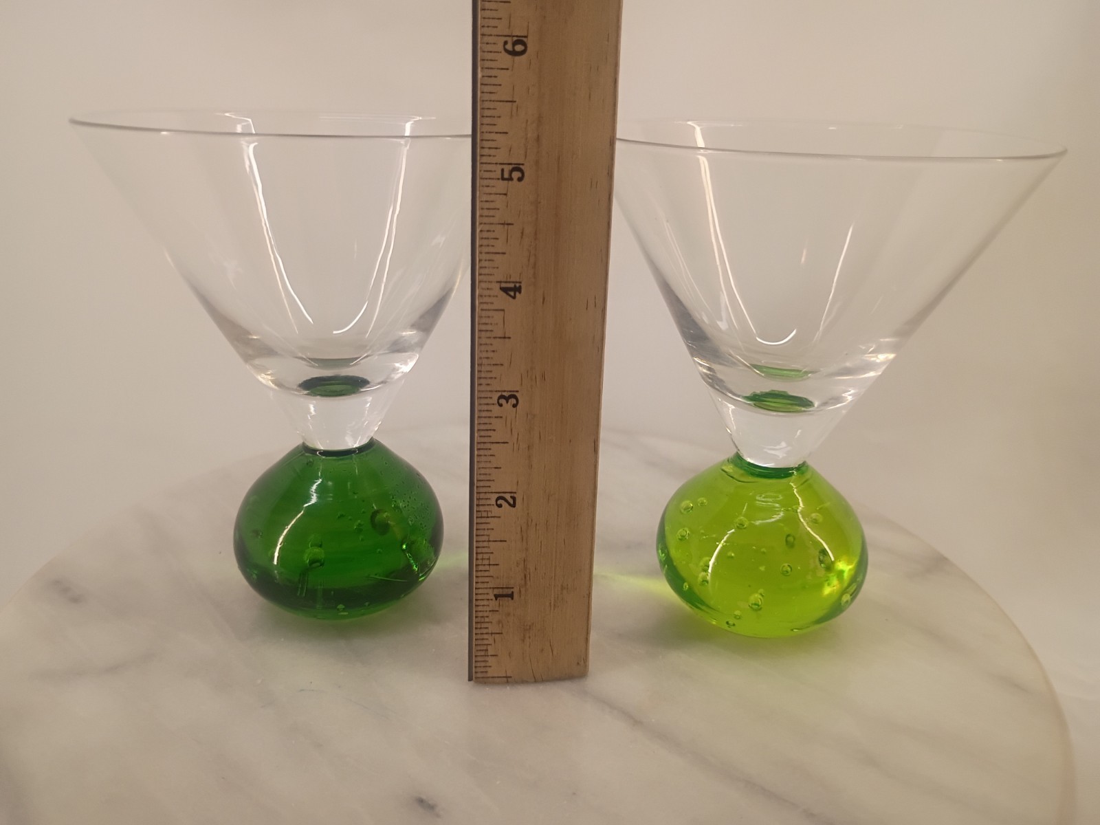 This product is a pair of vintage handmade martini glasses with unique green bubble ball stems. The round shape and hand-blown design add a touch of elegance and charm to any home bar or dining table. The green color adds a pop of interest to the classic martini glass silhouette, making it a stylish and eye-catching addition to your glassware collection. Perfect for serving your favorite cocktails in style. Thank you for visiting my listing today and thank you for your interest in this item! My goal is to have a pleasant transaction resulting in a satisfied customer. I hope any transaction between us leaves you with a feeling of confidence knowing you can trust me and the items I offer here. *Most if not all my listings are set to accept offers. Feel free to send an offer and I will be happy to consider it!! *Please contact me with any questions or concerns and I will be happy to help. *Always examine the photos carefully, and if in doubt, email me with any questions you may have. *Please note that condition statements are offered as a guide only. They will always be somewhat subjective and reflect our opinion, which may not necessarily agree with someone else's opinion. PLEASE READ: I aim to please and I want my buyers to have a positive transaction with me. If you have questions, concerns, or special requests related to any of my items I hope you will contact me so we can work them out to your satisfaction. I sell my items to give you a great item at a decent price while making a little profit at the same time. If you feel the item you are interested in is too pricey do not hesitate to send me a fair offer and I will consider it. My goal is to satisfy your needs and mine so both parties can benefit. SHIPPING: If you prefer a different shipping method or company please contact me and I will do all I can to make that happen. If you have concerns or requests about the packaging of your item contact me and I will do all I can to accommodate them. Shipping costs are based on location in each state or country, the costs always differ. After I have received your payment I will ship your item out within 3 business days or less excluding weekends and holidays. BEFORE PURCHASING & BIDDING: **Please see all the pictures. I do not have great photography skills but I try to get the most accurate photos I can. If you are unsure about something you see in a photo contact me so I can do what I am able to answer your concern about the item. **I cannot stress enough that if you have any questions or concerns please contact me before purchasing and bidding. Communication can solve so much. **As a customer myself, I understand the meaning of customer satisfaction and my goal is to have nothing but satisfied customers. If you are not unsatisfied with your purchase I ask that you please contact me so I can take care of your issue. My goal is for you to be 100% satisfied. INTERNATIONAL BUYERS WELCOMED - PLEASE NOTE: I welcome International buyers! Please be aware that any custom/duties/taxes that the parcel might incur once it is out of the USA are the responsibility of the buyer. Please check with your country's customs office to determine what these additional costs will be prior to bidding or buying. Please refer to the eBay Site Map for more information if needed.