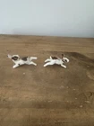 This product is a pair of vintage miniature figurines made of bone china. The rabbits are brown and white in color and were made in Taiwan. They are not handmade and are not associated with any specific brand. The figurines are small in size and would make a great addition to any collection of animal figurines. No chips or cracks