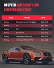 *OEM Part Number: Rear Left 3W0616001 3W0616001B 3W0616001C 3W0616001E 3W5616001 3W5616001A 3W5616001C 3W5616001D 3W7616001 3W7616001A 3W7616001C 3W7616001E 3W8616001 Rear Right 3W0616002 3W0616002B 3W0616002C 3W0616002E 3W5616002 3W5616002A 3W5616002C 3W5616002D 3W7616002 3W7616002A 3W7616002C 3W7616002E 3W8616002 *Item Specifications: Pair Rear Air Suspension Shock Strut For Bentley Continental GT GTC VW Phaeton *OEM Part Number: Rear Left 3W0616001 3W0616001B 3W0616001C 3W0616001E 3W5616001 3W5616001A 3W5616001C 3W5616001D 3W7616001 3W7616001A 3W7616001C 3W7616001E 3W8616001 Rear Right 3W0616002 3W0616002B 3W0616002C 3W0616002E 3W5616002 3W5616002A 3W5616002C 3W5616002D 3W7616002 3W7616002A 3W7616002C 3W7616002E 3W8616002 *Item Specifications: Key Words: Pair Rear Air Suspension Shock Strut For Bentley Continental GT GTC VW Phaeton Package Includes: Pair for Rear Left and Right Air Suspension Shock Strut Notes : Please double confim the compatibility as well as the OEM number before purchasing. Instruction is not included. Professional installation is recommended. *Compatibility Chart: 1, You can distinguish specific model of an automobile by VIN(Vehicle Identification Number). 2, VIN(Vehicle Identification Number) consists of total 17 English letters and arabic digits. 3, VIN does not include the letters I (i), O (o), and Q (q) (to avoid confusion with numerals 1 and 0). Bentley Continental Flying Spur Sedan 4-Door 6.0L 2006-2012 Flying Spur Speed Sedan 4-Door 6.0L 2009-2012 GT Coupe 2-Door 6.0L 2003-2012 GT Speed Coupe 2-Door 6.0L 2008-2010 GTC Convertible 2-Door 6.0L 2007-2012 GTC Speed Convertible 2-Door 6.0L 2010-2011 R Coupe 2-Door 6.8L 2003 Supersports Convertible 2-Door 6.0L 2011-2012 Supersports Coupe 2-Door 6.0L 2010-2012 T Coupe 2-Door 6.8L 2003 Volkswagen Phaeton V8 Sedan 4-Door 4.2L 2004-2006 W12 Sedan 4-Door 6.0L 2004-2006 * Generation & Evolution: Bentley Continental GT Grand Tourer Version First generation (2003-2011) Second generation (2011-2018) Third generation (2018-present) Bentley Continental GTC Convertible Version GTC First Version (2006-2009) GTC Speed Mulliner Driving Specification (2009-2011) GTC Speed 80-11 Editions (2010) GTC W12 (2011-2018) GTC V8 (2012-2018) Bentley Continental Flying Spur Four-Door Saloon First generation (2005-2012) Second generation (2013-present) Volkswagen Phaeton First generation (2002-2006) First Facelift 2007 Second Facelift 2010 *Platform Drive Layout : Bentley Continental Front-Engine, Rear-Wheel-Drive Layout Volkswagen Phaeton F4 Front-Engine Longitudinally-Mounted, 4Motion Four-Wheel Drive *Installation Guideline: 1.Installation is in the reverse order of air strut removal. Adhere to all manufacture's specifications for torque values. * Frequently Asked Questions : How to prevent the damage of air springs/How to extend the service life of air springs/struts etc.? An air strut with separable air springs If your vehicle offers a separable air suspension (Audi Allroad A6 C5, Mercedes-Benz W164, BMW X5, etc.), you should regularly (about once a week) lift the car to the maximum position, and remove dirt with a high-pressure cleaner (keep the cleaner at a distance to the air spring about 30 cm/12 inches, otherwise water pressure can damage the air spring). The highest position may vary depending on your model and regulation options. Therefore, please test this by trying the different modes available to you (Sport, comfort, dynamic, off-road) and choose the one that sets your vehicle to the highest position. The dirt will most likely be found under the fold of the pneumatic chambers. If you find a frozen layer of bitumen on the piston guide (the part of a strut on which the air spring is installed), it is recommended to clean it as well. Whenever possible, avoid riding on fresh asphalt, as fresh bitumen mixed with sand immediately results in a build-up of abrasives on the piston and in turn contributes to accelerated wear and tear of the air spring. A complete air suspension shock Many cars such as Mercedes W220 or W211 are set up with a complete air strut - shock absorber and air spring visually form a complete spare part. In many cases, you can easily recognize these by the metal cups with which the air spring is tightly mounted. To best avoid any damage, we highly recommend to regularly check the condition of the dust protection seals of the air strut. What is the difference between an air spring and an air strut? The air spring is a part of the air strut. Some vehicles (e.g. Mercedes ML) allow you to change the air spring separately. At our online shop you have the opportunity to buy either the whole air strut or only the air spring. For some type of vehicles it is not possible to change the air spring separately. In this case the whole air strut should be replaced. Which side of my car is the Right and Left? The right and left sides of an automobile are determined as if sitting in the car facing forward. Thus, the left side is on the left when sitting in the car facing forward, and the right side is on the right. For American cars, the driver’s side is on the left, and the passenger sits to the right of the driver. For cars in Japan, Britain, Ireland, the Bahamas and some other former British colonies -- where they drive on the left side of the road -- the passenger sits on the left side, and the driver (along with all the driving controls) is on the right. Item Specifics Placement on Vehicle Right Rear Left OE/OEM Part Number 3 3W7616002C 3W7616002E 3W8616002W0616001 3W0616001B 3W0616001C 3W0616001E 3W7616002A Single Weight(KG) 7.890 Included Hardware None Maximum Operating Pressure (psi) 195 Minimum Operating Pressure (psi) 90 Drive Layout Front Engine RWD & 4WD Platform D1 Material Iron Aluminium Alloy Rubber Color Silver Black Type Air Suspension Shock Custom Bundle No Return Policy 30 Days Free Return Manufacturer Warranty 1 Year Quantity 2pcs Fitment Type Direct Replacement OE Spec or Performance/Custom OE Spec Adjusta