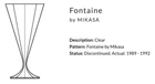 I usually ship next business day! I also offer a combined shipping discount,if you purchase more than one item, you must purchase first, then once I pack and print out the label, I will issue you a partial refund for the difference.Pair of Fontaine by MIKASA Description: Clear Pattern: Fontaine by Mikasa Status: Discontinued. Actual: 1989 - 1992 Water Goblet Fontaine by MIKASA Product Information Height: 6 7/8 in Blown Glass Discontinued Piece Flat panels with vertical ribs