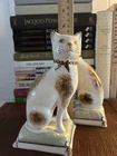 Your chance to own an Exquisite pair of large Staffordshire Cats. We Purchased these in England 40 years ago. They were made by Willian Kent Potteries about 1950. The Calico cats strike a pose sitting on sea-foam green pillows trimmed in gold. They are wearing gold collars. Rare large size: 7 1/2” tall Pillow is about 4” in width and 3” deep. In EXCELLENT condition with no chips or cracks. Ships from Naples, Florida