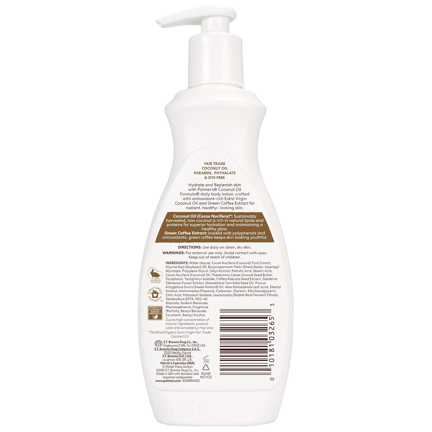 Palmer's Coconut Oil Formula Body Lotion for Dry Skin, Hand & Body Moisturizer with Green Coffee Extract & Vitamin E, Pump Bottle, 13.5 Fl Oz (Pack of 1) Brand Palmer's Item Volume 399 Milliliters Item dimensions L x W x H 2 x 3.5 x 9 inches Age Range (Description) Adult Special Feature Not Tested On Animals About this item Body Lotion: This raw, natural Coconut Oil Lotion in a convenient pump bottle delivers luxurious moisturization for decadently pampered skin all day long; Great for all skin types Special Formula: This moisturizing body lotion for dry skin is crafted with antioxidant-rich Coconut Oil and Green Coffee Extract to soften, hydrate and pamper for radiant, healthy-looking skin and 48 hour moisture Finest Ingredients: We use only the finest natural, raw ingredients for soft, hydrated and beautiful hair & skin. We support sustainable production of Shea & Cocoa Butter and Coconut Oil. You can feel good about what you put on your hair and skin Choose What's Real: Our nourishing skin care and hair care products feature real, high-quality, plant-based ingredients. Our product line for whole body care includes body butter, creams, balms, lotions, oils, soaps, pregnancy and stretch mark care Why Palmers? For over 180 years, Palmer's has crafted treatment-oriented beauty products using Cocoa Butter, Coconut Oil, Shea Butter, Olive Oil & Vitamin E to soothe, hydrate, soften, replenish and revitalize skin and hair