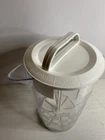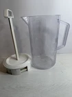 This Pampered Chef Quick Stir 2 QT Mixing Pitcher is a must-have for any kitchen. With its checkered pattern and glossy finish, it is perfect for all occasions. The pitcher is made of durable plastic and is dishwasher safe for easy cleaning. It features a lid and has a capacity of 2 quarts, making it perfect for mixing ingredients or serving beverages. The pitcher is manufactured in the United States and comes with a manufacturer warranty. This contemporary style pitcher is perfect for any home and is sure to impress guests.