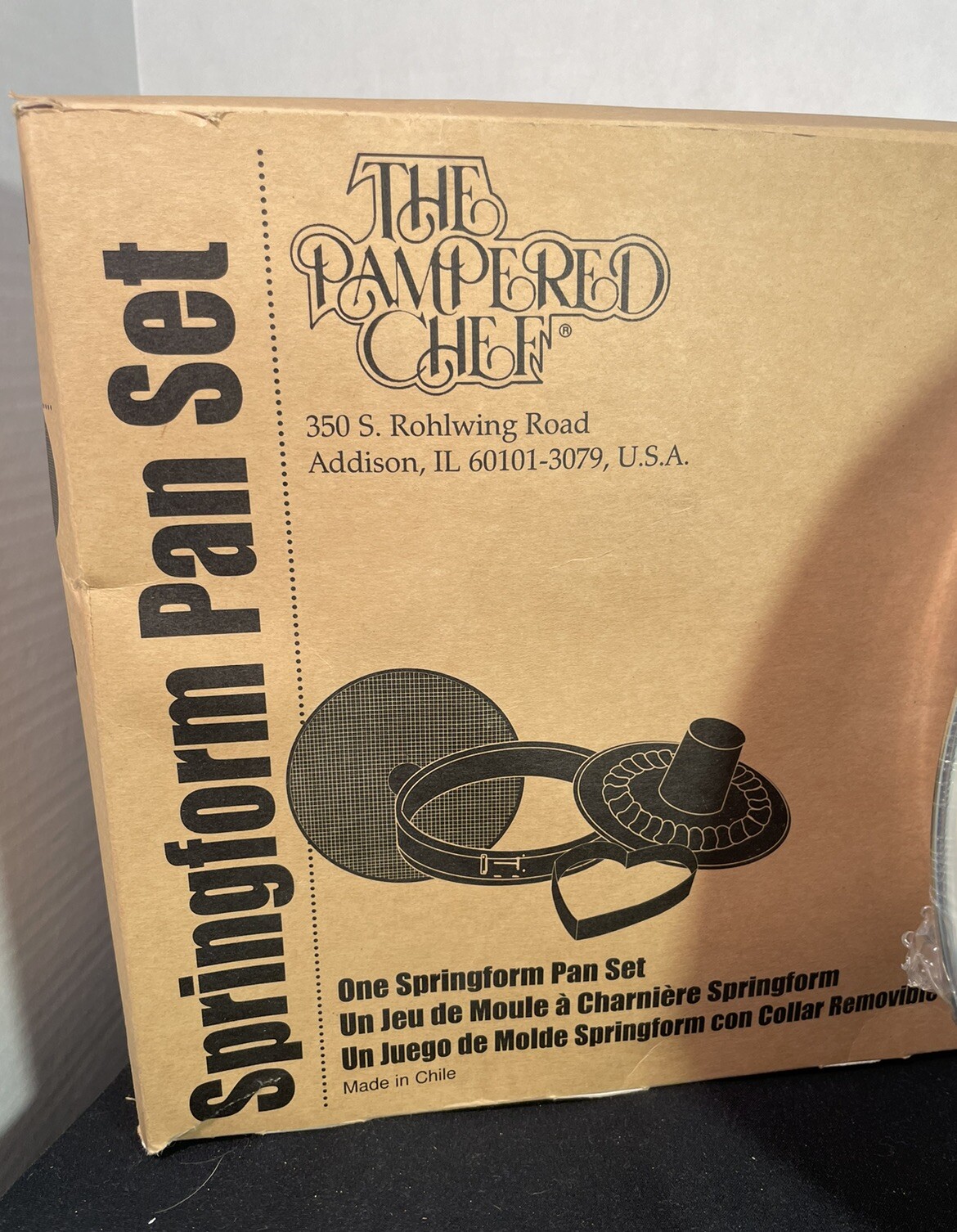 This Pampered Chef Springform Pan Set #1540 is a must-have for all baking enthusiasts. The set includes a round 9-inch springform pan and a heart-shaped pan, both made of high-quality aluminum material. The pans are perfect for baking cakes, pies, and other desserts in the oven, whether it's electric or gas. The silver-colored pans have a beautiful design that will complement any kitchen decor. They are easy to clean and maintain, ensuring that you can use them for years to come. Made in the United States, this set is a great addition to your bakeware collection. These are in their original box and still wrapped in factory applied plastic. See photos!
