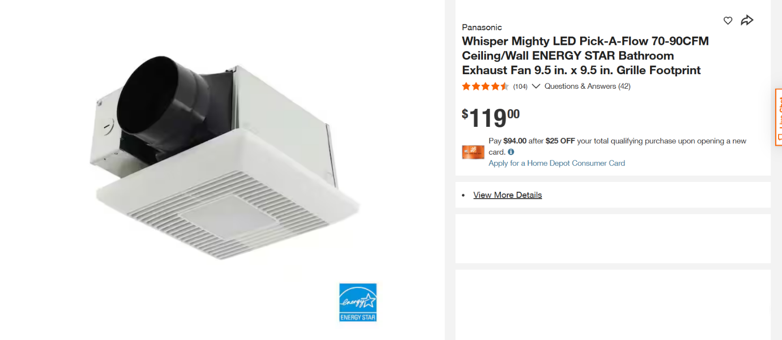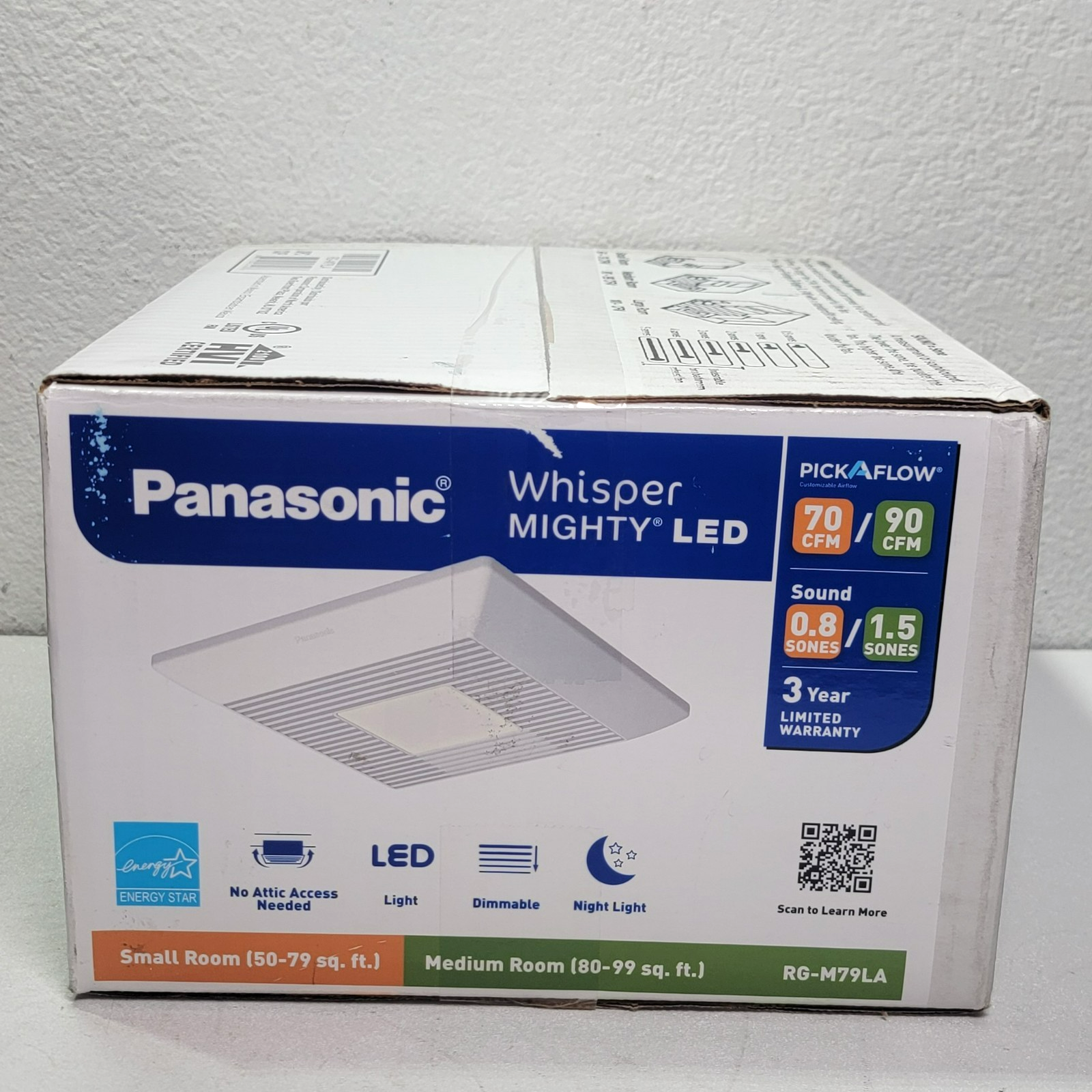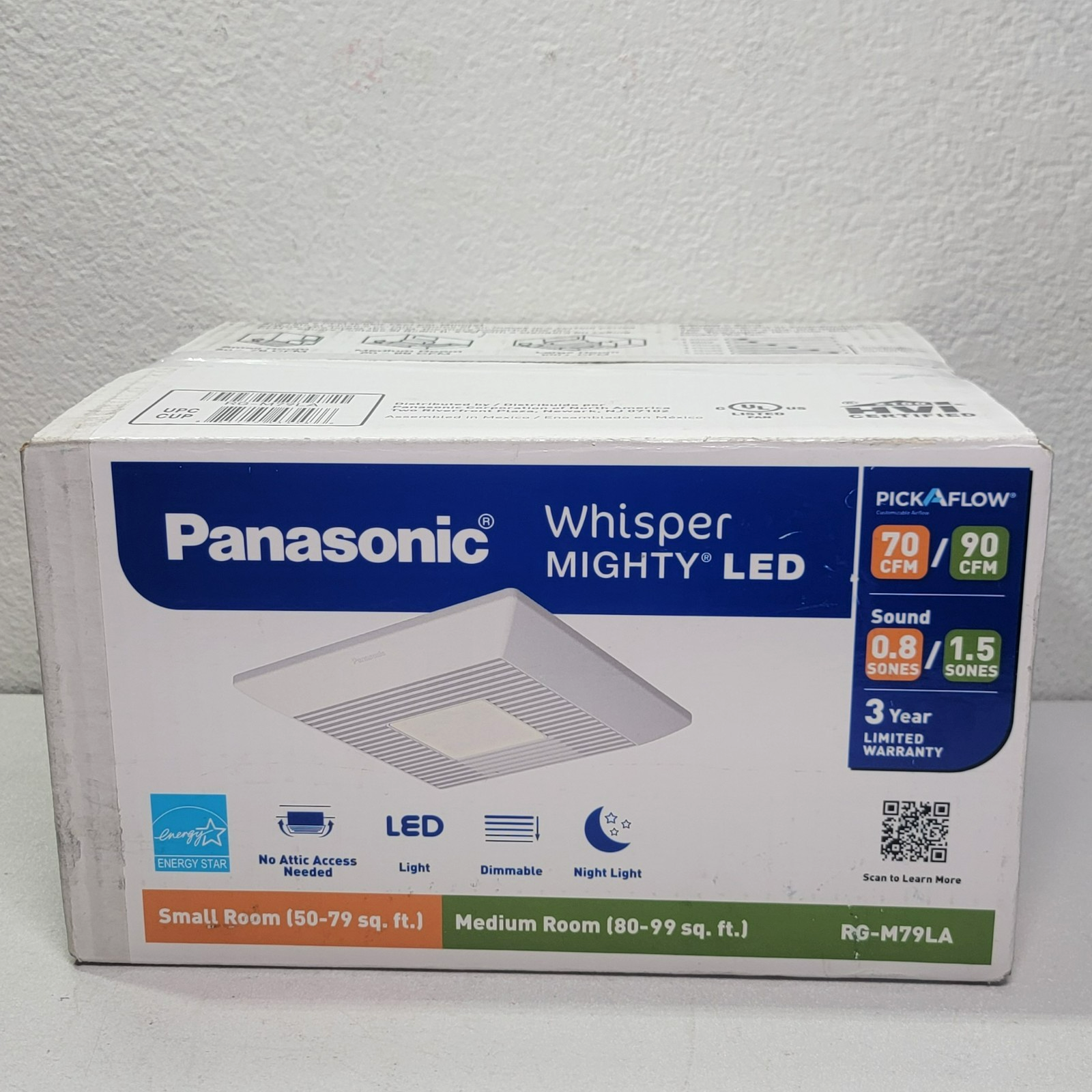 The Panasonic Whisper Mighty LED Pick-A-Flow 70-90CFM Ceiling/Wall Exhaust Fan is a high-quality ventilation system designed for bathrooms. With a clean white finish and a square grill shape, this fan is both functional and stylish. It features an integrated LED light bulb for added convenience. The fan operates on 120V with an amperage of 0.19, providing a maximum air volume of 90 CFM. Easy to install with included hardware and designed for a medium room size, this Panasonic exhaust fan is a reliable choice for improving indoor air quality.Condition is new only open box.C#15A
