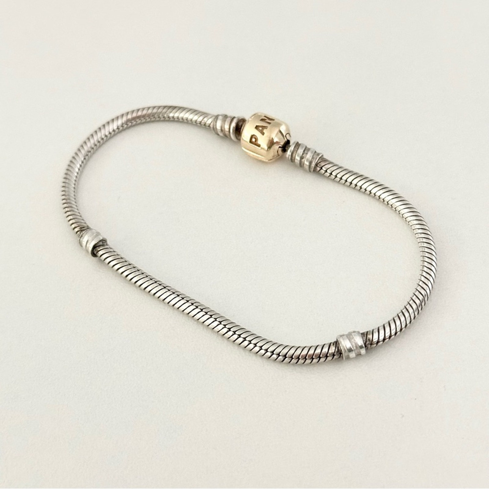 Authentic Genuine Pandora Two Tone Moments Snake Chain Bracelet •Set in sterling silver with a solid 14k yellow gold clasp •Size: 7.5" •Stamped 585 ALE •Excellent condition •Perfect to add to your Pandora bracelet collection or to gift to a friend, mom, girlfriend, daughter, wife, etc. •Please check out my other Pandora charms for sale, bundle and save on shipping! •Fast shipping! I ship same or next business day!