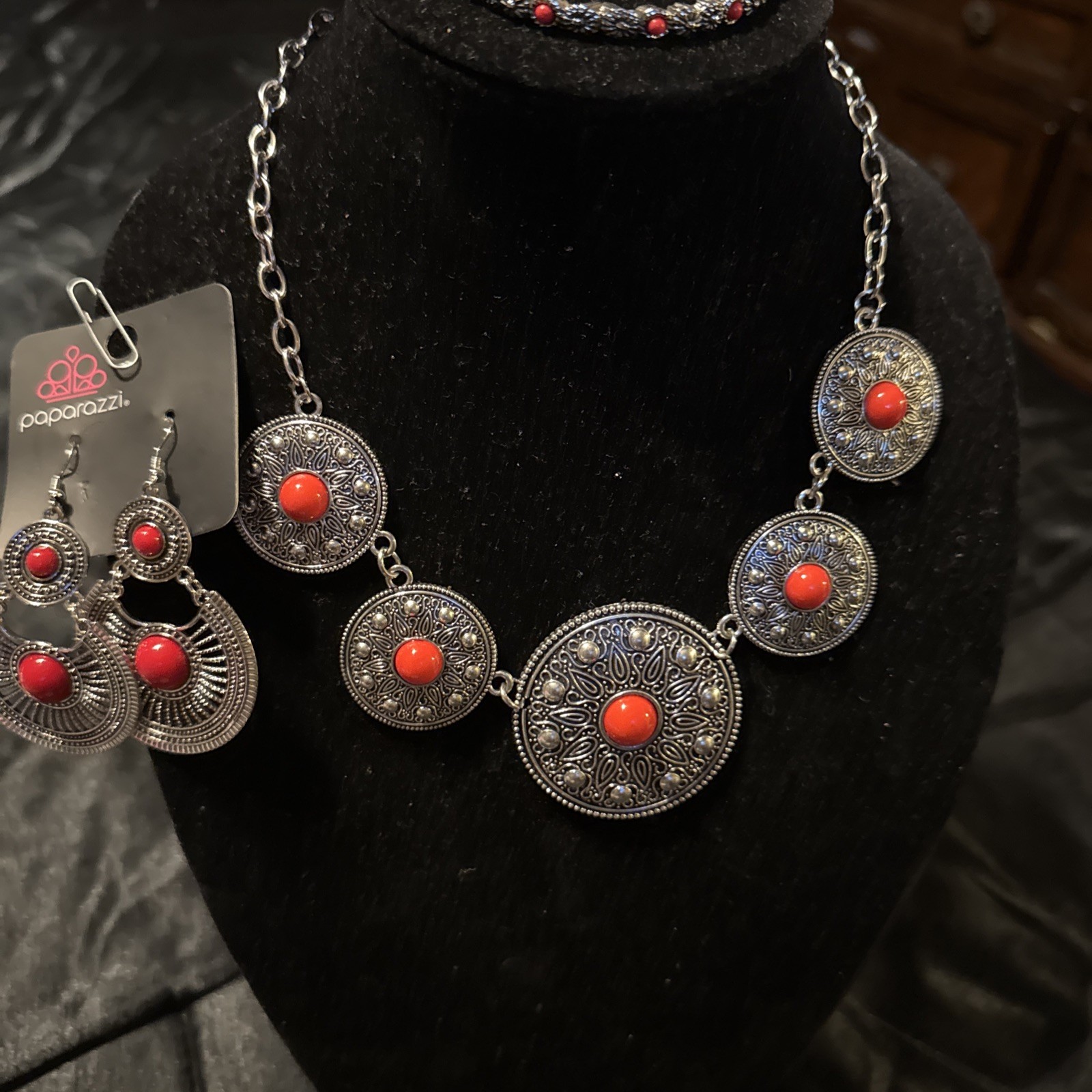 Paparazzi Jewelry Set Beautiful Red & Silver Necklace, Bracelet,Earrings