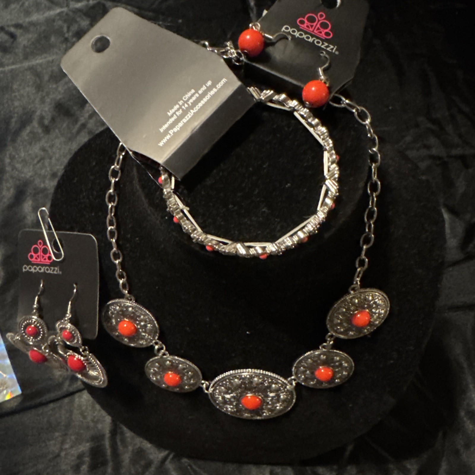 Antique:NoMain Stone Color:RedMetal:SilverColor:Silver And RedSigned:NoSeller Warranty:NoHandmade:NoMaterials sourced from:ChinaWholesale:NoVintage:NoType:Jewelry SetBrand:PaparazziCountry of Origin:ChinaOccasion:Birthday, AnniversarySet Includes:Bracelet, Earrings, NecklaceTheme:BeautyFeatures:AdjustablePersonalize:NoCustomized:No