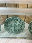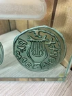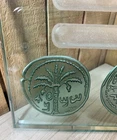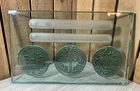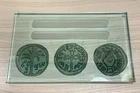 Heavy Clear Glass Paperweight Pen Holder with Embedded Coin Designs with Light Green Tinting. Approximately 9 3/4" x 6" x 5/8" and weighs 3 pounds. This is in very good used condition as seen in the photos. There are a few light scratches from normal use. Please see all photos as they are part of the description. We try to list as many details as possible, however some items are vintage and pre-owned so flaws are to be expected. We try to find out as much information as possible on each item we have available. On occasion we may make a mistake and appreciate your feedback.