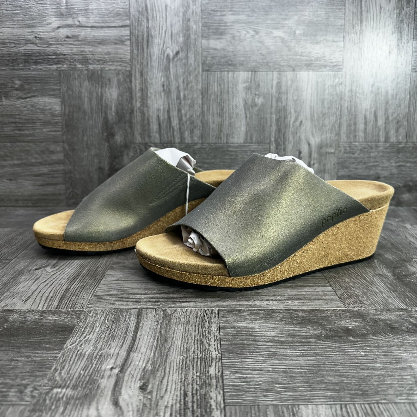 The Papillio Namica Rivet sandals by Birkenstock in women's size 9 (EURO 40) feature a stylish wedge heel design in olive green color. Made with leather upper material and a rubber outsole, these sandals are perfect for casual occasions in the summer, fall, and spring seasons. The mid heel height and slide style offer comfort and a trendy look, while the Birkenstock brand and logo accents add a touch of individuality to the overall design.