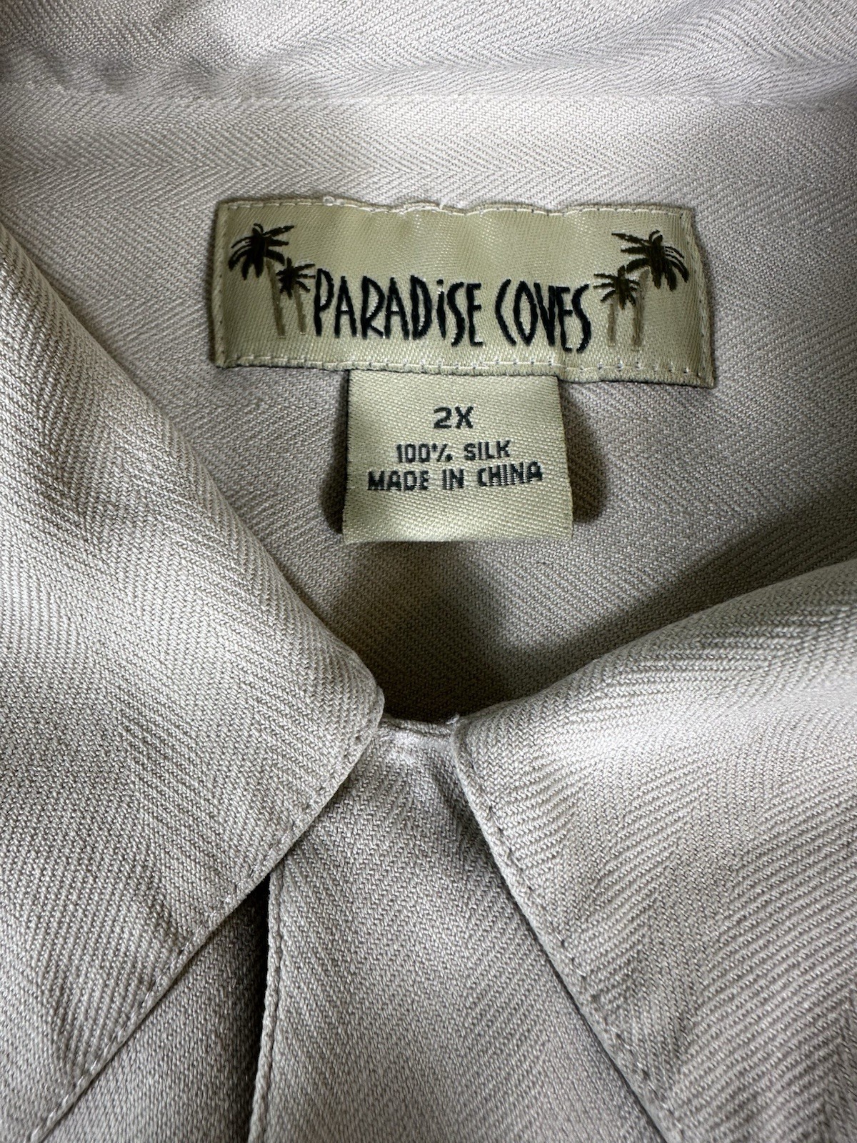 The Paradise Coves Men’s 100% Silk Shirt in size 2X is a stylish and comfortable choice for casual occasions. With a floral pattern in beige and tan colors, this short sleeve button-down shirt features a collared neckline and button accents. Made from lightweight and breathable silk fabric, this shirt is perfect for summer and all seasons. The Hawaiian theme adds a touch of relaxation to the overall look, making it a versatile addition to any man's wardrobe. 2443
