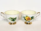 Paragon 5pcs Tea Cups & Saucers Appointment The Queen World Famous Roses. Very nice condition beautiful small mix of two patterns two peace pieces and 3 yellow rose pieces no chips or cracks some gold coloring rubbed off the top of the tea cups and one of the saucers. Two of the larger saucers measure 5 1/2" across the smaller saucer measures 4 3/4" across. Tea cups measure 3 5/16" across 3" tall