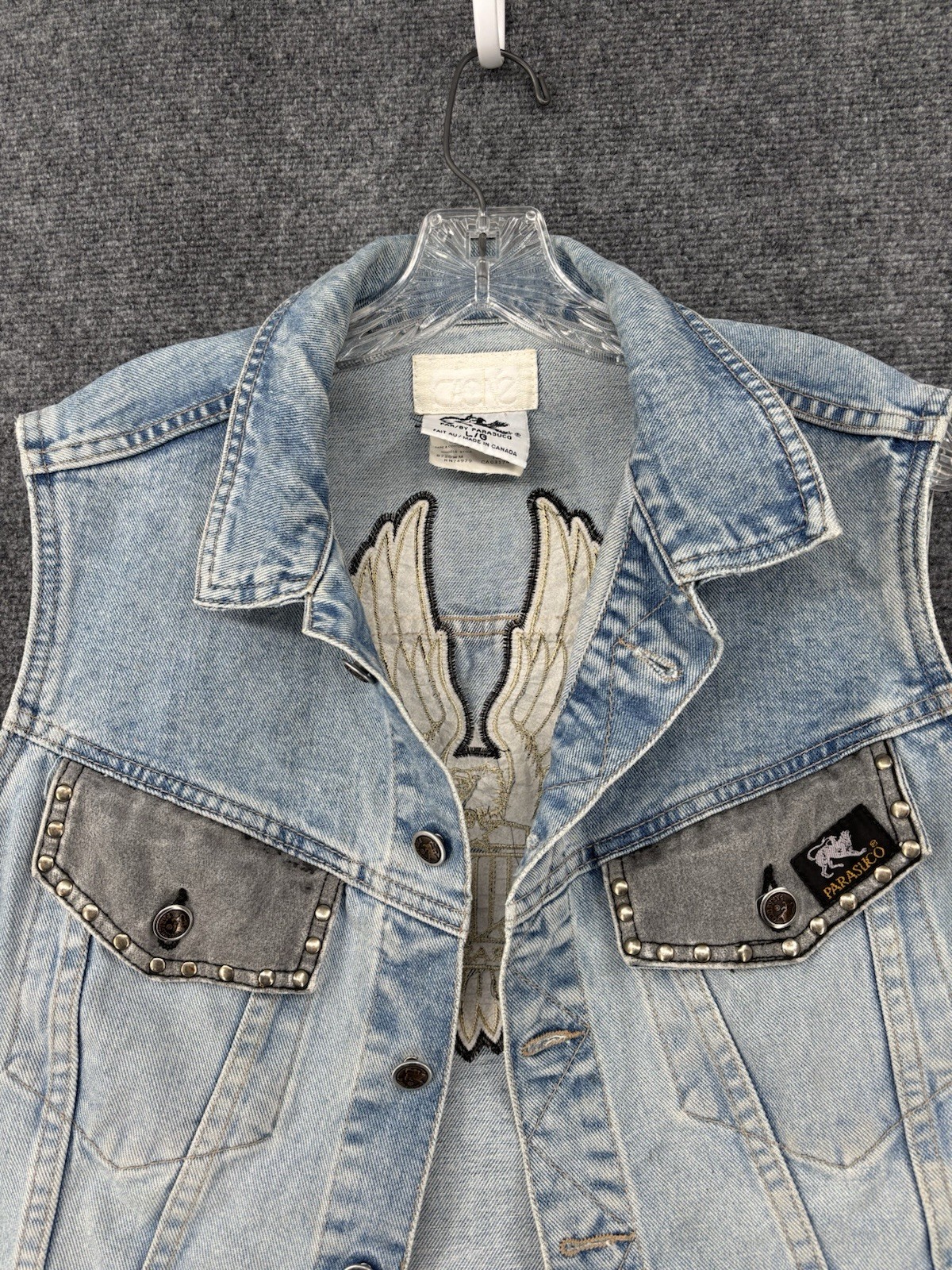 Parasuco Cache Distressed Denim Vest Women’s Large with Eagle Wing Studded Patch