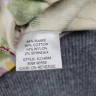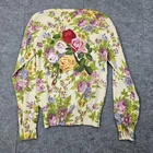 Brand: Parfait Item: Button-front cardigan sweater Tag size: Womens Medium (M) Color/Pattern: Ivory/cream base with multicolor floral print (purple, green, yellow, blue, pink) Material: 54% Ramie, 30% Cotton, 14% Nylon, 2% Spandex Style details: Crew neckline; long sleeves; ribbed cuffs and hem; shiny button closure Design features: Allover floral knit on front and back; large embroidered/appliqué rose bouquet on back with bead accents; additional small bead details on floral motifs Style code: 6234RM | RN# 96568 Country of origin: Made in China Fit/notes: Lightweight knit with some stretch; see photos for measurement references and details Special notes: Please review all photos to confirm colors, details, and embellishment placement