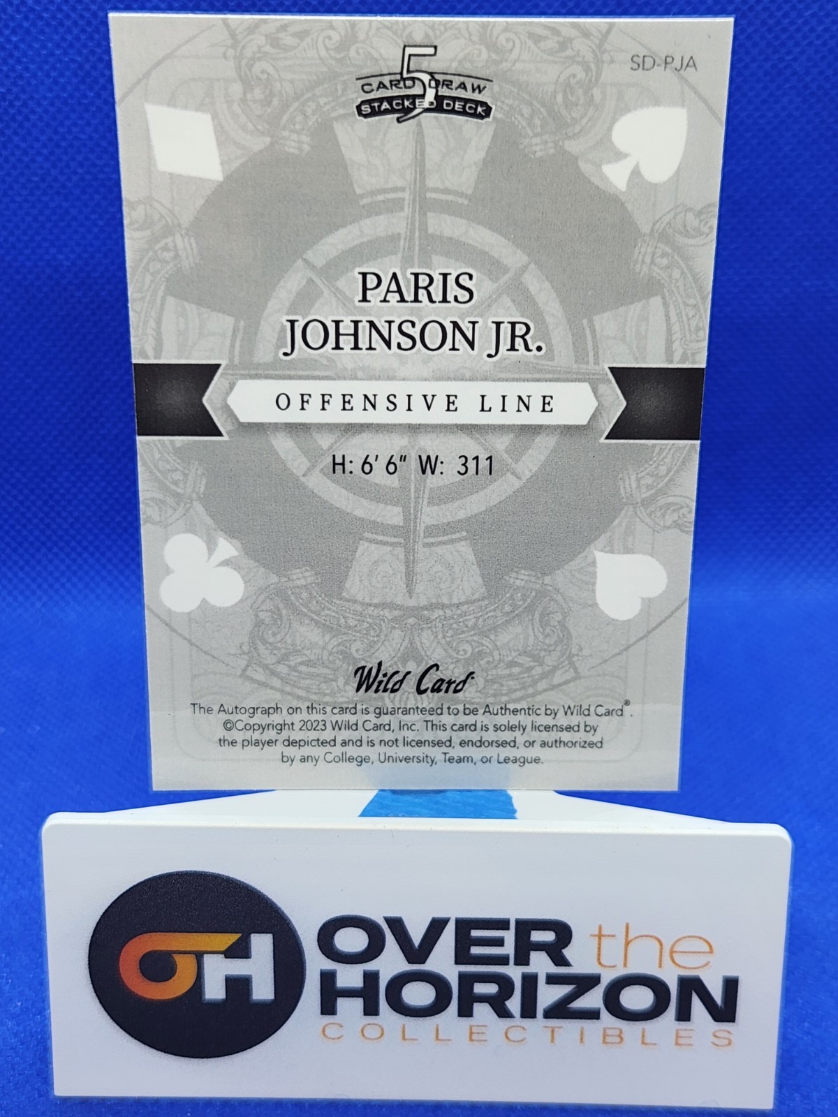 The product is a rare and highly sought-after trading card featuring an autograph from Paris Johnson Jr., a talented player from the National Football League (NFL). This limited edition card is part of the 2023 Wild Card set and is numbered #1/2, making it a unique and exclusive collectible for football fans and card collectors. The card is also a part of the 5 Card Draw - Stacked Deck - 10 Of Clubs insert set and is authenticated by Wild Card, adding to its value and authenticity. With its red refractor parallel variety and serial numbering, this card is sure to be a prized possession for any football enthusiast.