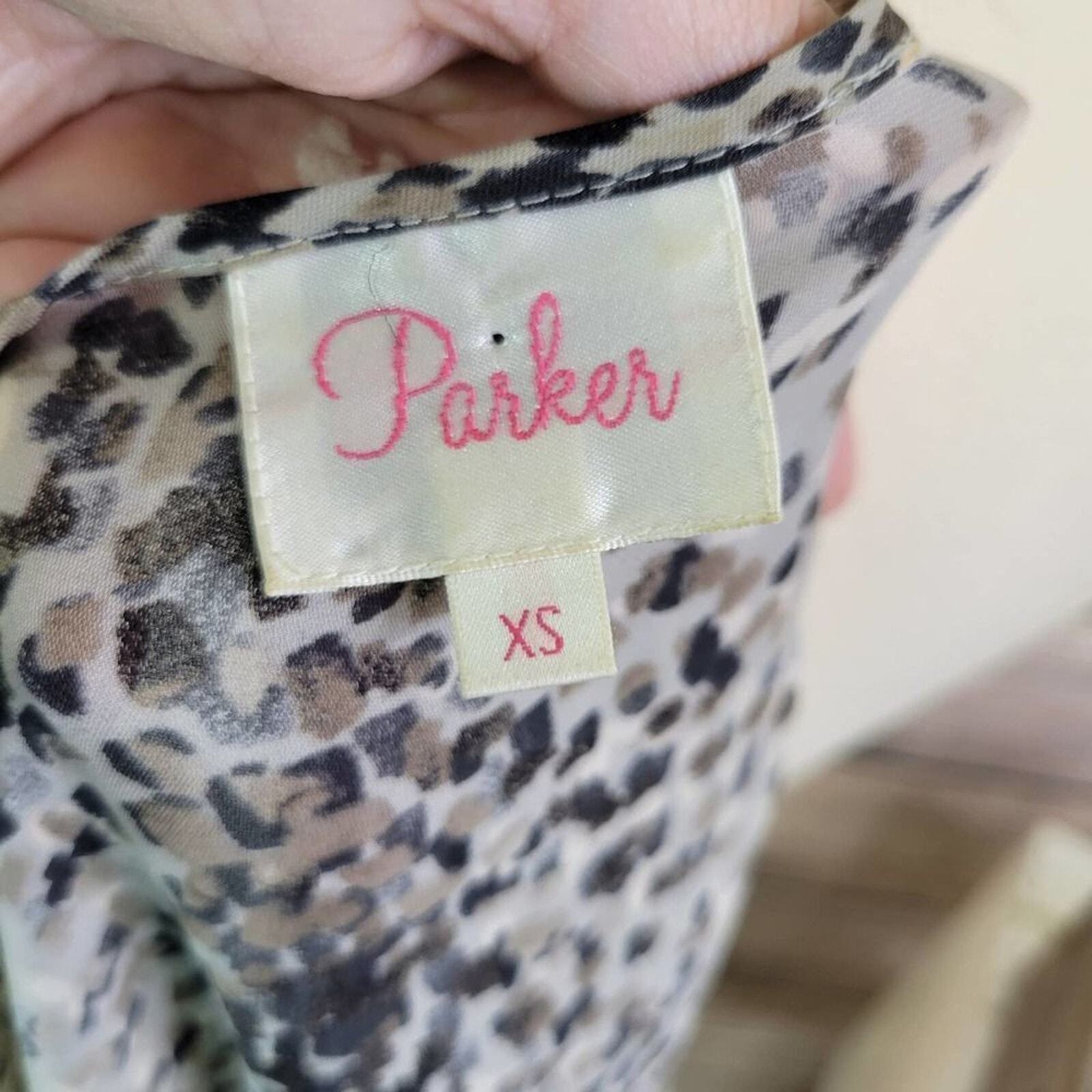 Parker Silk Georgette Print Keyhole Top. 100% silk . Keyhole opening. Pullover Style. Sheer. Double seamed placket in front. Colors are gray, cream, and brown. Kimono sleeves.. Size Extra Small. 100% Silk. Excellent Used Condition. Approximate Measurements Armpit 19" flat Bust 19" flat Length 21"