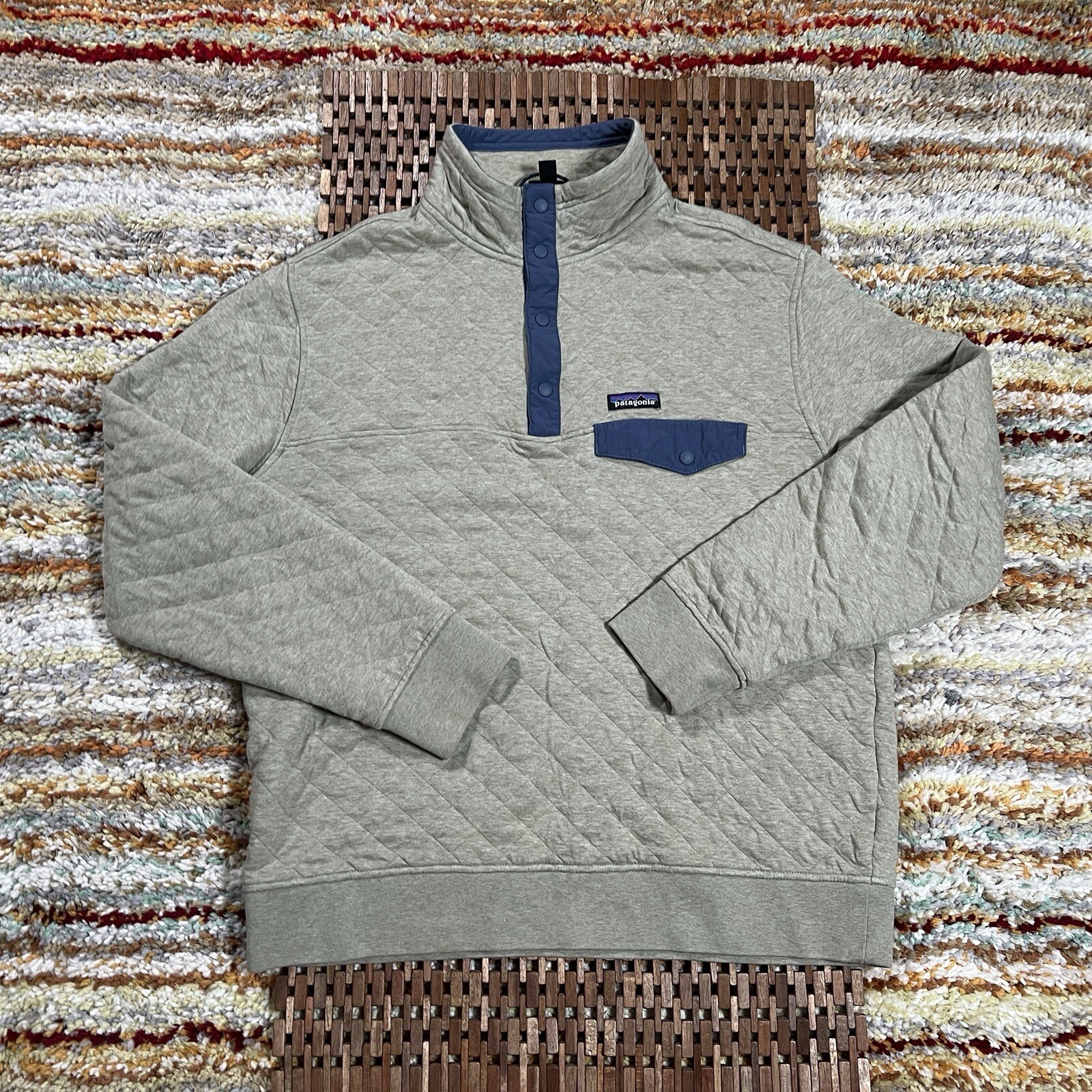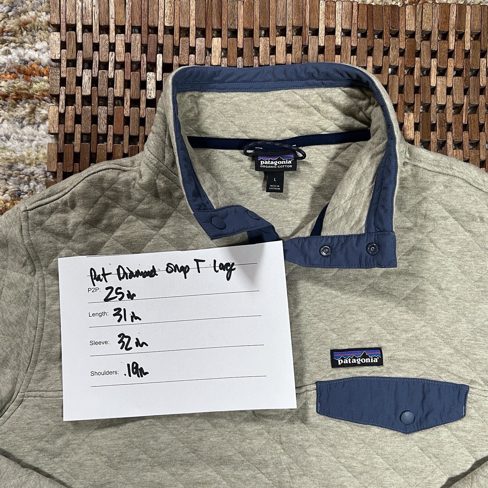 This is a Patagonia Diamond Quilted Snap T Pullover Fleece Jacket in beige with blue accents, designed for men in size Large. The jacket features a quilted design with an embroidered logo, a mid-length fit, snap closure, and a stand-up collar. Made from cotton jersey fabric, it is suitable for outdoor activities in winter, fall, and spring. Perfect for casual wear or travel, this classic-fit jacket is machine washable.