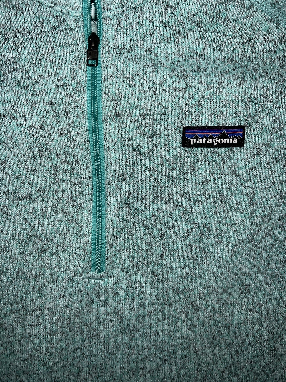 The Patagonia Jacket Women Better Sweater 1/4-Zip Pullover in Mint Green is a stylish and cozy outerwear piece perfect for the colder seasons. Made from polyester fleece, this pullover features a zip closure, long sleeves, and a collared neckline for added warmth and comfort. With a regular fit and mid-length style, this jacket is both practical and fashionable, making it suitable for various occasions such as travel, casual outings, or even a party. The mint green color adds a pop of freshness to any outfit, while the breathable design keeps you comfortable throughout the day.