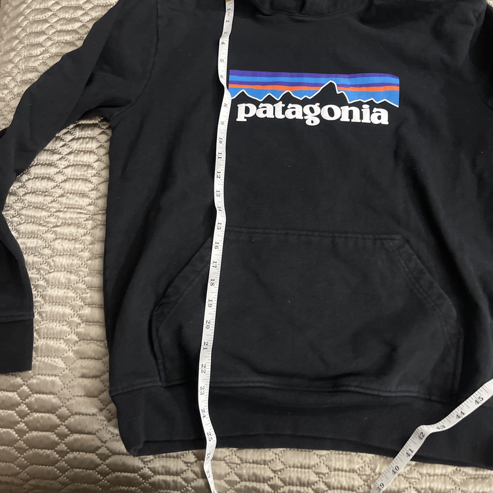 The Patagonia Men’s Black Hoodie in size medium features a graphic print design with a drawstring closure and long sleeves. Made from a blend of polyester, elastin, and cotton, this pullover hoodie is machine washable for easy care. The regular fit and hooded style make it comfortable for activities like walking, school, gym training, and casual outings. With accents of the Patagonia logo, this classic black hoodie is perfect for winter, fall, and spring seasons, offering both style and functionality for the outdoor enthusiast or casual wearer.