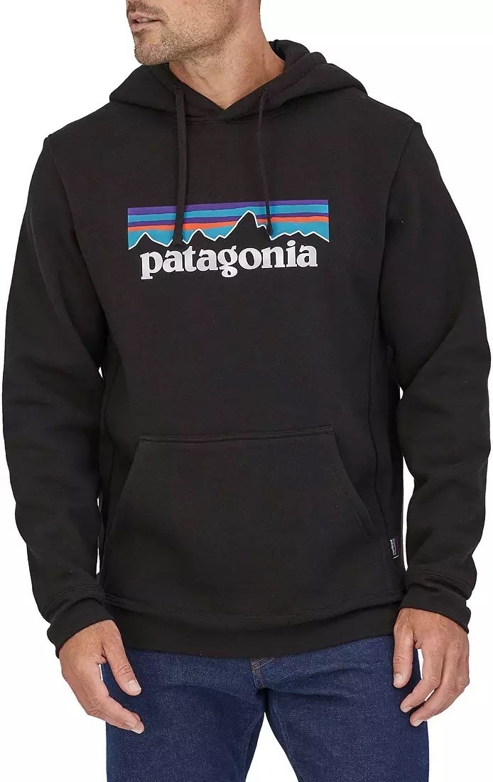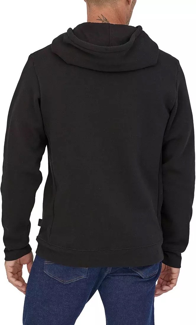 The Patagonia Men's P-6 Uprisal Pullover Hoodie in size Medium is a stylish and versatile garment made from a comfortable cotton blend fleece fabric. The hoodie features a solid black color with accents of white, blue, and red, making it a colorful and eye-catching addition to any wardrobe. It has long sleeves, a drawstring closure, and a regular fit, making it suitable for various activities such as gym training, walking, and hiking. This hoodie is machine washable and proudly manufactured in Mexico, making it a practical and sustainable choice for any season.