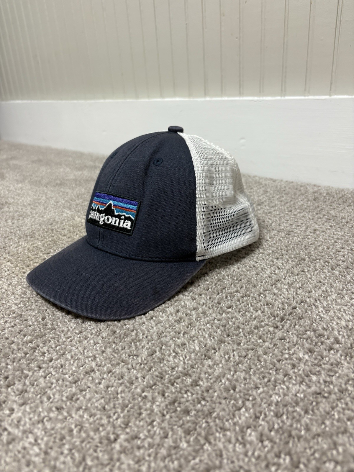 Stay cool and stylish with this authentic Patagonia P-6 Logo Trucker Mesh Hat . Featuring Patagonia’s classic embroidered logo on the front, breathable mesh back panels, and an adjustable snapback closure, this cap is perfect for outdoor adventures or everyday wear. Features: Brand: Patagonia Style: P-6 Logo Trucker Mesh Hat Color: Black front with Blue mesh back Size: One Size (adjustable snapback closure) Material: Organic cotton front, polyester mesh back Design: Curved brim with embroidered Patagonia P-6 logo Breathability: Mesh panels for ventilation Condition: Used – shows some fading from normal wear, but overall in good condition. Logo, mesh, and snapback closure remain intact. A versatile and durable hat from Patagonia—great for hiking, travel, or casual everyday style.