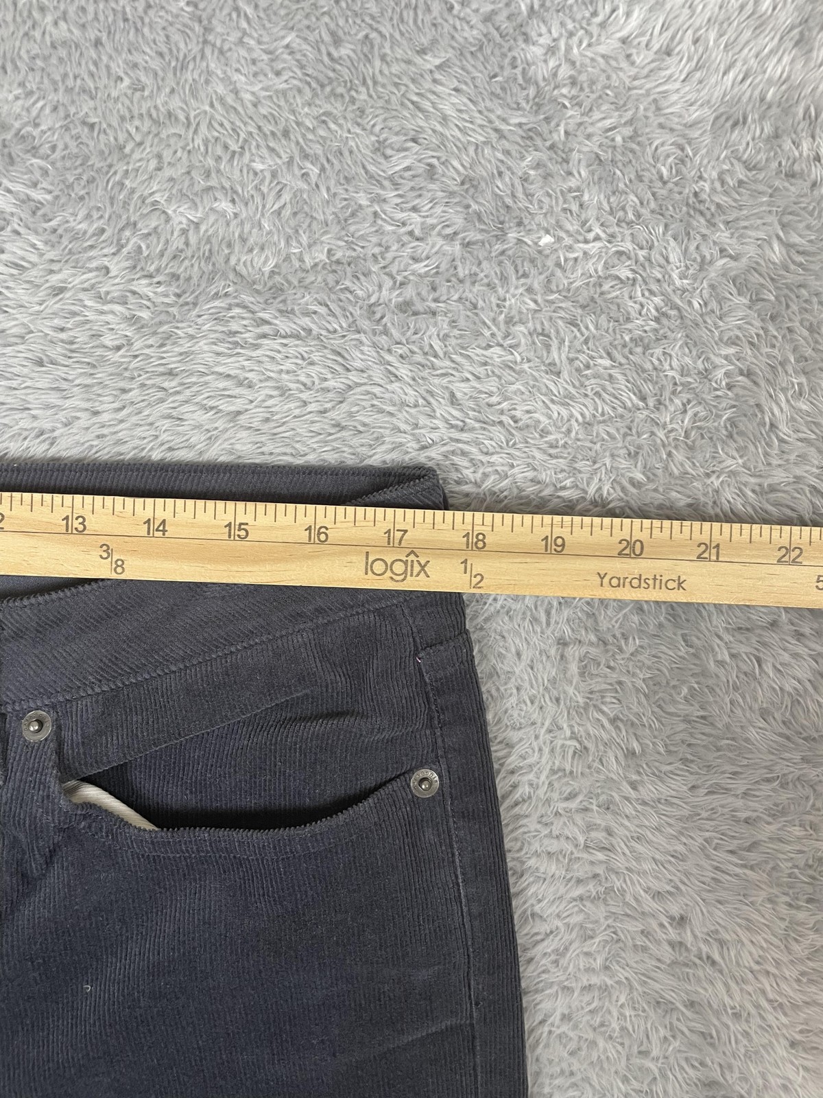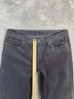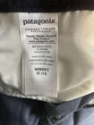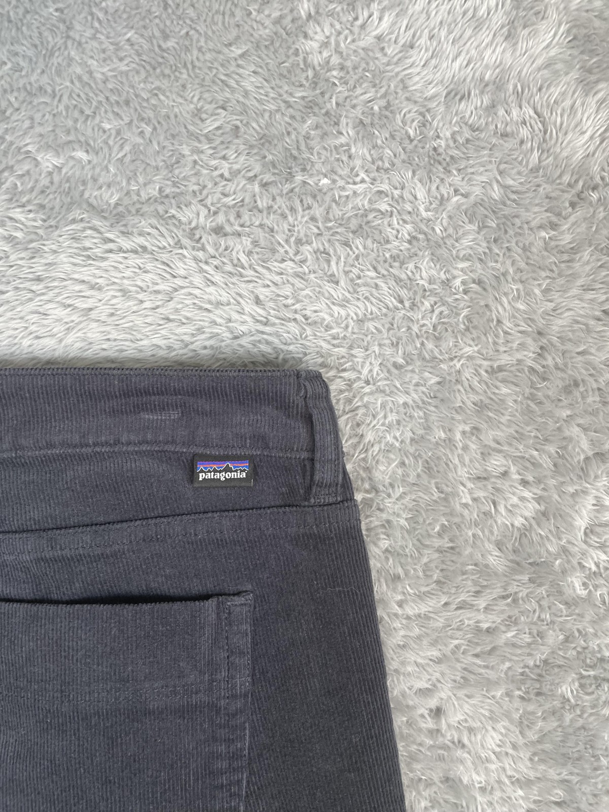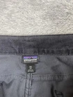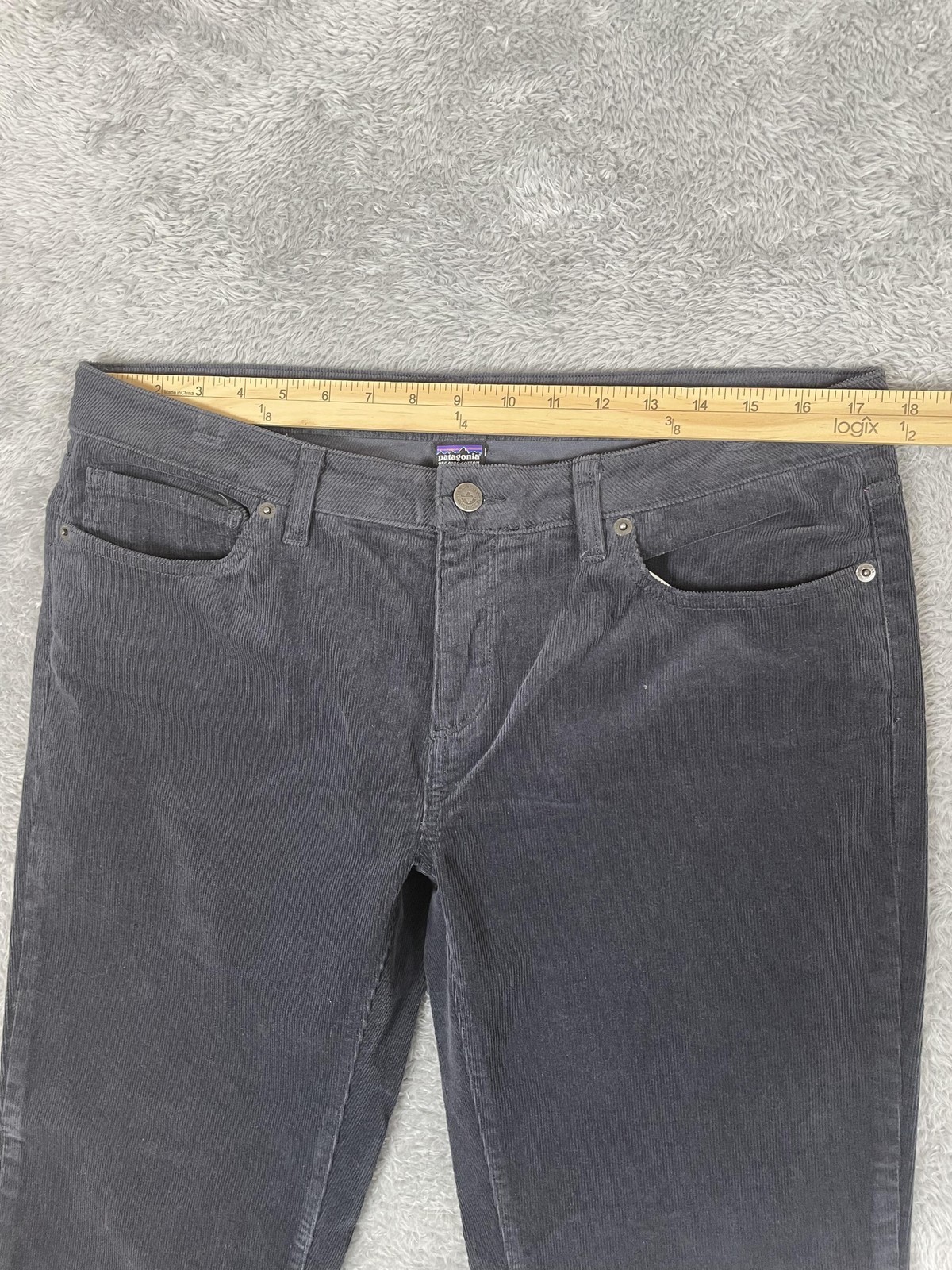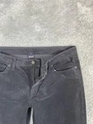 Brand: Patagonia. Style: Women's organic cotton stretch corduroy straight-leg chino pants with classic five-pocket styling. Color: Gray (solid dark charcoal tone). Size on tag: Women's 32 (numeric size 14 regular). Material: 98% organic cotton, 2% spandex corduroy; made in Sri Lanka. Details: Fixed waistband with belt loops, zip fly with metal button closure, and classic five-pocket jeans-style layout including front scoop pockets with coin pocket and back patch pockets. Straight-leg silhouette with full-length inseam and soft midwale corduroy fabric with built-in stretch designed for casual everyday wear and light outdoor activities. Branding and tags: Small woven Patagonia logo flag at the back waistband. Inner label features the Patagonia Common Threads Partnership message encouraging repair, reuse, and recycle, and lists Women's 32 (14) and Made in Sri Lanka. Style and label information: RN 51884; style code STY55060FA15; PO 213239; additional code SMDB; Patagonia P.O. Box 150, Ventura, CA 93002 USA. Care: Refer to inner care tag for complete washing and drying instructions.