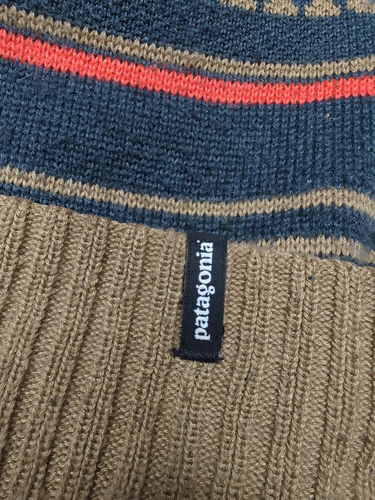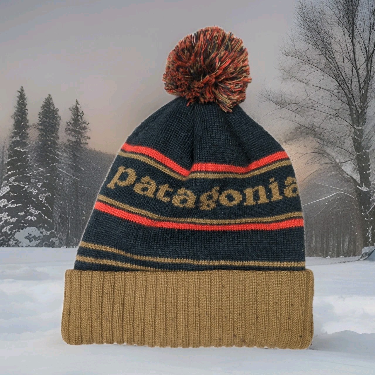 PATAGONIA POWDER TOWN STOCKING CAP BEANIE WINTER HAT KHAKI BROWN BLUE AND ORANGE COLOR Made with 100% recycled polyester fleece with a textured knit construction, this timeless beanie is itch-free and quick-drying. Fair Trade Certified™ sewn. Made from soft and comfortable 100% recycled polyester with a textured knit construction Rib-Knit Cuff Patagonia original art Pom-Pom Styling Fair Trade Certified™ Sewn Made in China 173 g (6.1 oz)
