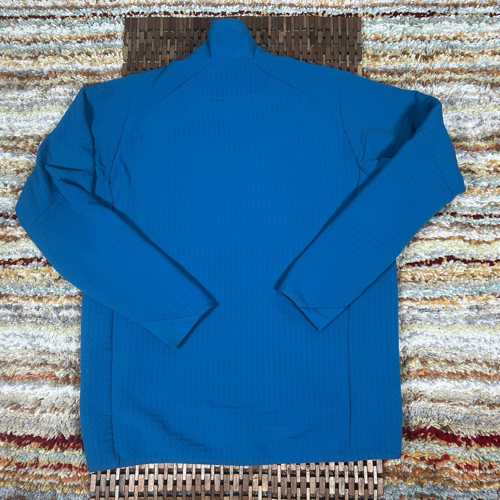 This is a Patagonia Regulator R2 Tech Fleece Jacket in Blue, size Large for men. It features a full zip closure, polyester outer shell and lining material, fleece fabric type, and polyester insulation. The jacket has a military style with accents like buttons, zippers, and the brand's logo. Designed for outdoor activities in winter, fall, and spring, it is suitable for travel, casual wear, and workwear, offering comfort and warmth for activities like skiing, hiking, and gym training.
