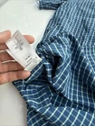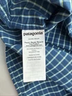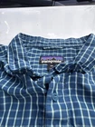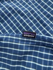 The product is a men's 2XL blue plaid shirt by Patagonia. It features a collared neckline with a button-down style, making it ideal for casual or travel occasions. Made of breathable cotton material, this short-sleeve shirt is machine washable and has a vintage fish-themed design, perfect for outdoor activities like camping, hiking, or fishing. The shirt also includes accents like a logo and a comfortable regular fit for a stylish and functional addition to any wardrobe.