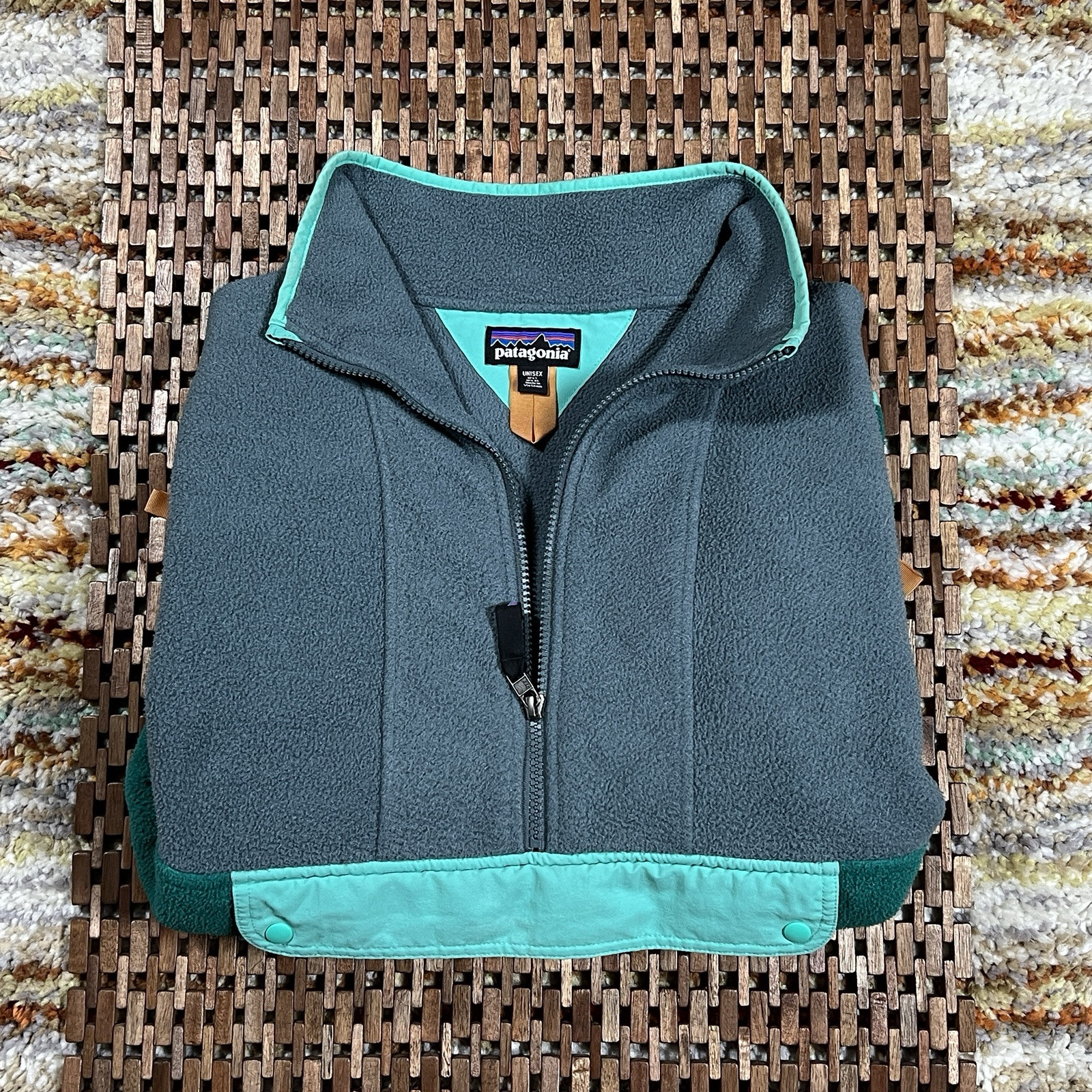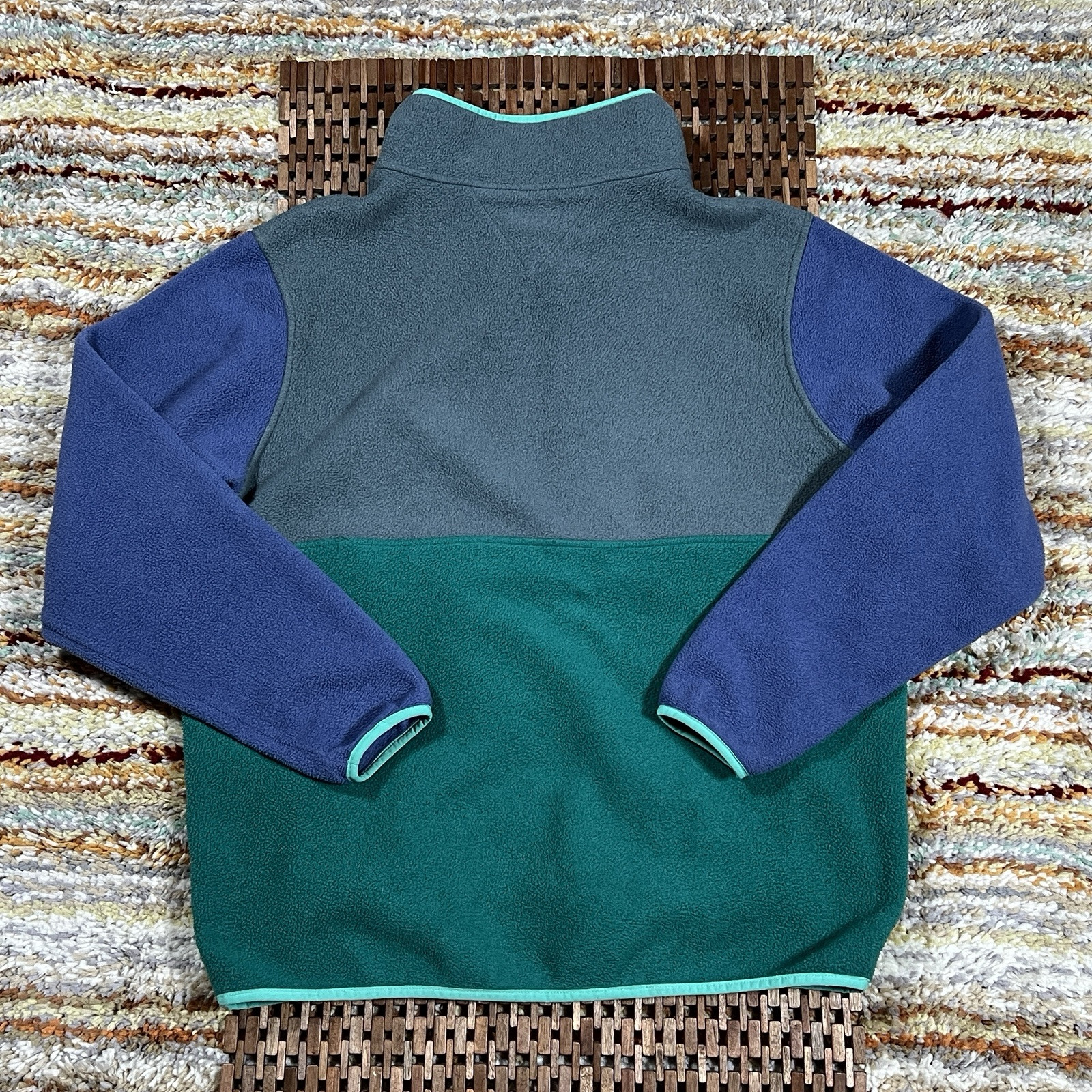 This is a Patagonia Synchilla Anorak Jacket in size Large for men. It is a half-zip fleece pullover in green and blue colors. The jacket features a windproof and lightweight design, suitable for winter and spring seasons. It has a stand-up collar, snap closure, and button accents with the brand's logo. Ideal for travel, casual, or formal occasions, and suitable for walking or hiking activities. Made of polyester with no specific pattern.