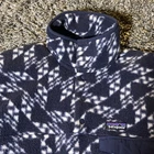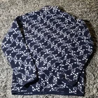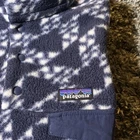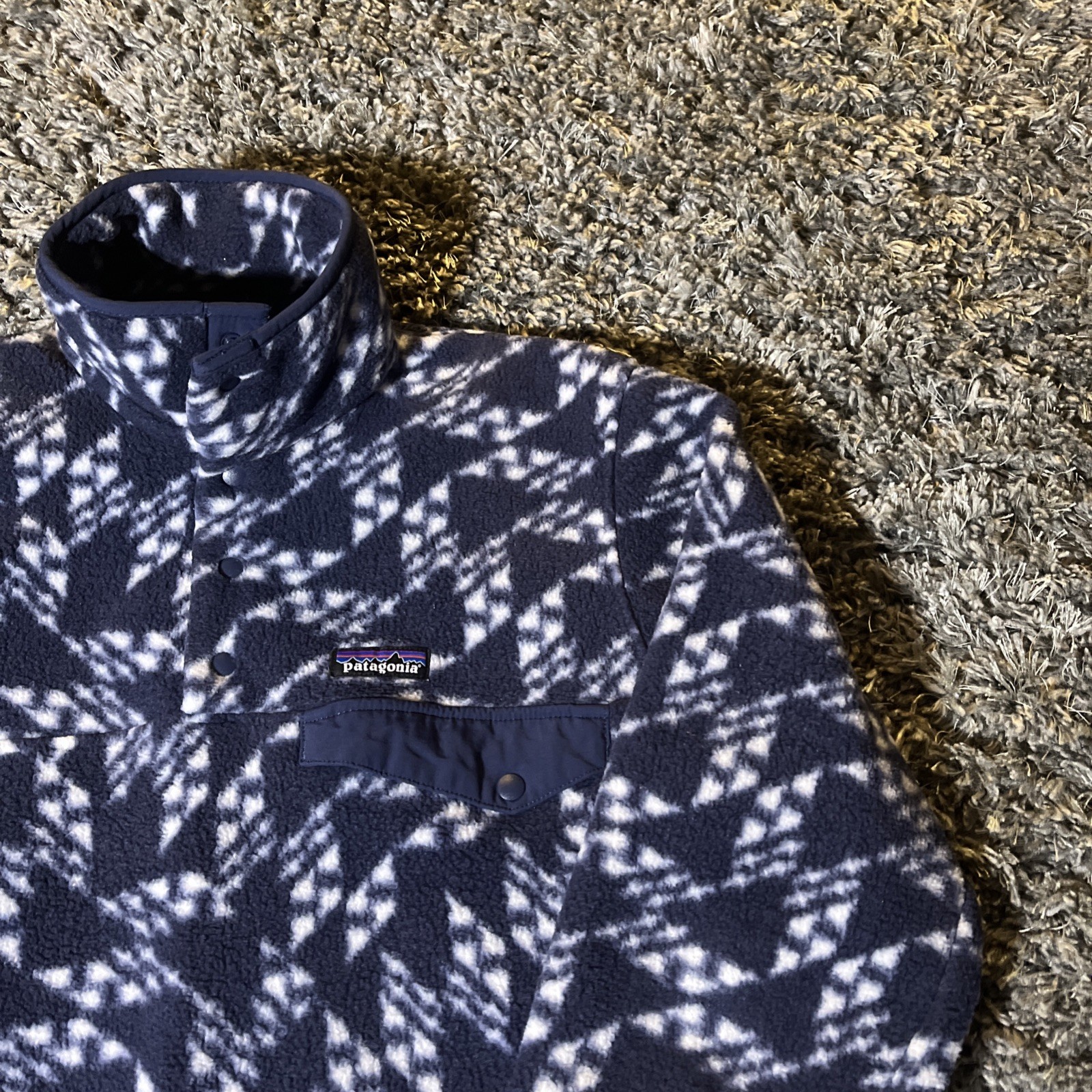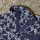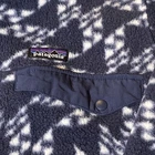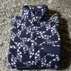 This Patagonia Synchilla Snap T fleece jacket is a perfect addition to your outdoor wardrobe. The navy blue color with a geometric pattern and white accents creates a classic and stylish look. The mid-length jacket features a stand-up collar, snap closure, and pockets for convenience. The fleece material is breathable, soft, and machine washable, making it perfect for walking, skiing, or hiking in the fall, winter, or spring. The jacket is a men's size small and fits regularly. The Patagonia Synchilla Snap T fleece is a must-have for any outdoor enthusiast.