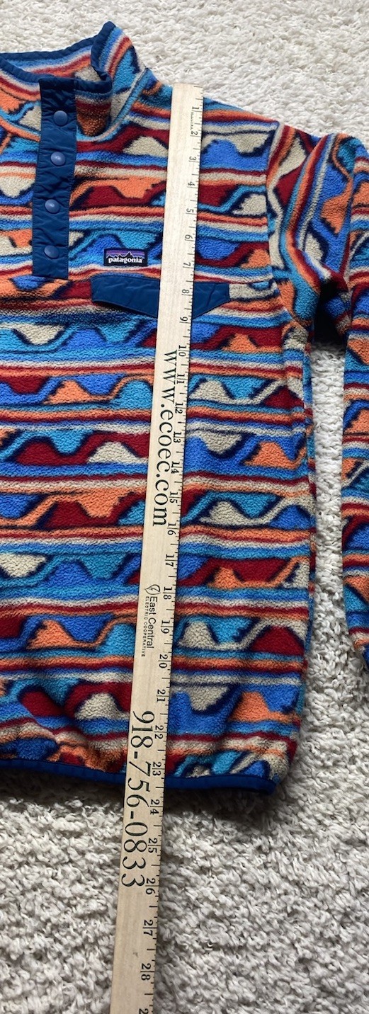 The Patagonia Synchilla Snap-T Fleece Pullover Jacket in Youth XL is a stylish and versatile outerwear option for kids. Made from 100% polyester, this jacket features a snap closure and a colorful Aztec-inspired design. Perfect for outdoor activities or casual wear, this basic jacket with a multicolor theme offers both comfort and style for young adventurers.