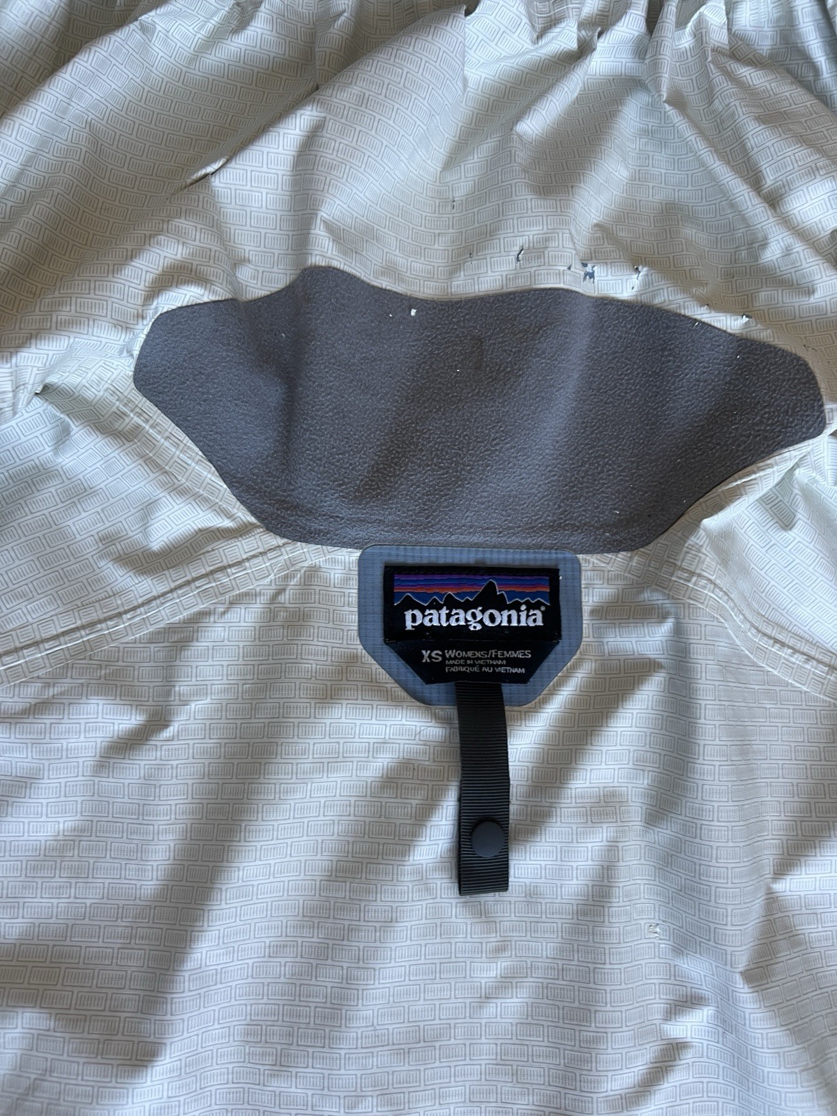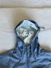 Patagonia Torrentshell Women’s XS rain jacket in blue. Lightweight, waterproof, packs down small, and features a full hood, pit zips, zip hand pockets, and adjustable cuffs. Important: The interior lining shows H2No delamination / flaking, common on older Torrentshell models (see photos). Exterior fabric, zippers, and hood are in great condition. Still completely wearable and great as a budget outdoor shell, hiking layer, or work jacket.