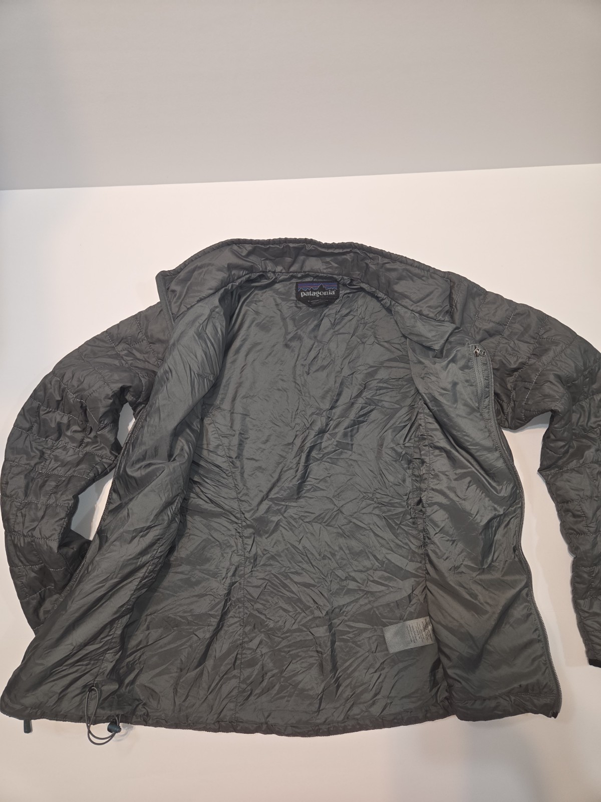 The product is a women's size small Patagonia Nano Puff jacket in grey, featuring a quilted design and full zip closure. Made of polyester, this short-length jacket is perfect for everyday wear and offers a comfortable fit. With its basic style and signature Patagonia logo, this jacket combines fashion and functionality for a versatile outerwear option. One small hole on front as shown in last 2 photos.