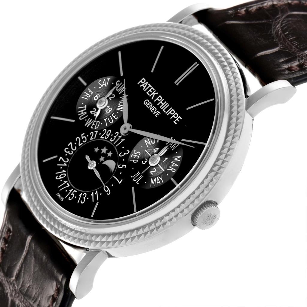 Patek Philippe Grand Complication Perpetual Calendar White Gold Mens Watch 5139G Patek Philippe Grand Complication Perpetual Calendar White Gold Mens Watch 5139G Click image to enlarge Description SwissWatchExpo 404-814-1814 Model number 5139G Stock number 69864 Gender Mens Movement Automatic self-winding mechanical movement. Serial number 586xxxx Jewels 27 Caliber 240 Case 18K white gold round case 38.0 mm in diameter. Transparent exhibition sapphire crystal caseback. Patek Philippe logo on the crown. Crystal Scratch resistant s apphire crystal. Dial Black dial with raised white gold baton hour markers and feuille hands. Three subdials displaying day, date, and month. M oon phase display in the 6 o'clock subdial. Bracelet Brown leather strap with an 18K white gold deployant clasp. Condition Excellent condition. Engravings None Box & papers Patek Philippe box. Exclusive SwissWatchExpo Certificate of Authenticity. Working condition Timed to precision on Witschi watch expert timing machine. Running strong and keeping the accurate time. Authenticity: Certified authentic. Our elite in-house team of Swiss-trained master watchmakers inspect and certify the authenticity and the condition of the watch. Warranty The watch is covered by Swiss Watch Expo's 18-month warranty on anything but abuse. Pictures All the photos are of the actual watch for sale. Payment - We ONLY accept payments in United States Dollars (USD). - Payments must be made within 5 days of winning the auction. Shipping Shipping Methods All shipments are sent fully insured, using the following carrier methods: * Domestic - UPS. * International - No international shipping available Terms of Sale 18 month Limited Warranty Swiss Watch Expo is honored to have the opportunity to serve you. That's why we stand by all of our products with a full 18 month limited warranty. If an item we sell you should fail as a result of a manufacturer's defect at any time during the first year and a half , we will repair or replace the item at absolutely no cost to you. Not covered by warranty: - Regular wear-and-tear from normal use. - External damage to the product. Any damages resulting from wear to the watch case, crystal/glass, watch bracelet, watch bezel, straps, screws, crown/stem, finishes, clasps/buckles, or any other physical damage to the watch. - defects caused by outside force or improper use. Consequential and incidental damages. - the loss of precious, semi-precious stones from settings. - Outside modifications and third party repair attempts of any kind will void the warranty. - Any damage if used under conditions which exceed the watch manufacturer?s water resistance guidelines. - Watches that are labeled as water resistant feature a screw down crown. The crown must be screwed down properly at all times to keep the watch casing watertight. Water damage is not covered under the warranty unless it is proven defective by the SwissWatchExpo Repair and service Center. Our 100% Money-Back Guarantee At Swiss Watch Expo, we understand that your purchase is a significant investment - one that you will pass down to future generations. That's why we're happy to give you a no-questions-asked money-back guarantee with no restocking fees. If you're not satisfied with your purchase, just let us know within 7 days after the purchase and we'll honor your return and issue a full refund, no questions asked. *Deductible amount for domestic shipping costs: $50 About Us This fine piece is a part of collection offered by Swiss Watch Expo , members of the National Association of Watch and Clock Collectors (NAWCC) and the International Watch and Jewelry Guild (IWJG). We are third generation jewelers who have been selling fine Swiss timepieces and elegant jewelry since 1982. We've built our reputation on quality, service and integrity, and we treat each customer with the utmost respect. We stand by all of our products with a generous warranty and guarantee, so you always know that when you bid with Swiss Watch Expo , you can can bid with confidence! About Swiss Watch Expo Thank you for the opportunity to serve you and welcome the Swiss Watch Expo ebay auction, where we proudly offer our collection of top quality Swiss timepieces and fine jewelry. We are third generation European trained master watchmakers and jewelry makers dealing in Fine Swiss watches, elegant gemstones and precious jewelry for nearly 30 years. Why You Should Choose Swiss Watch Expo Unlike many online resellers, at Swiss Watch Expo , we have built our business the old fashioned way - through our brick and mortar store in Atlanta, Georgia, providing our customers the very best products at an incredible value, while giving them the exemplary service they deserve. Now, as we serve the Ebay community, our commitment to the same philosophies holds true. We invite you to browse through our customer feedback to read about the experience others have had with us through Ebay. What Makes Swiss Watch Expo Products Better Than The Competition Every watch we sell has been completely inspected to ensure years of optimal functionality. What's more, there are never any middlemen involved in the process. From the time we purchase a watch, our experianced master watchmakers handle all repairs and restoration, making the watch as good as new. We've invested thousands into our state-of-the-art repair facility in order to carry out our commitment to quality. As for jewelry, every item is of the highest quality, using only the finest precious metals and gemstones available. When You Choose Swiss Watch Expo , You Have Nothing To Lose When you purchase an item from Swiss Watch Expo on Ebay, you have complete peace of mind. That's because we offer you a generous money-back guarantee without any restocking fee, no questions asked. Our philosophy is simple: By being committed to quality, service and value, we have satisfied customers who come back to us time and time again. Our entire staff is committed to providing you