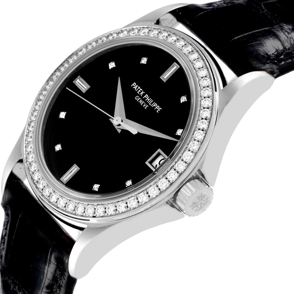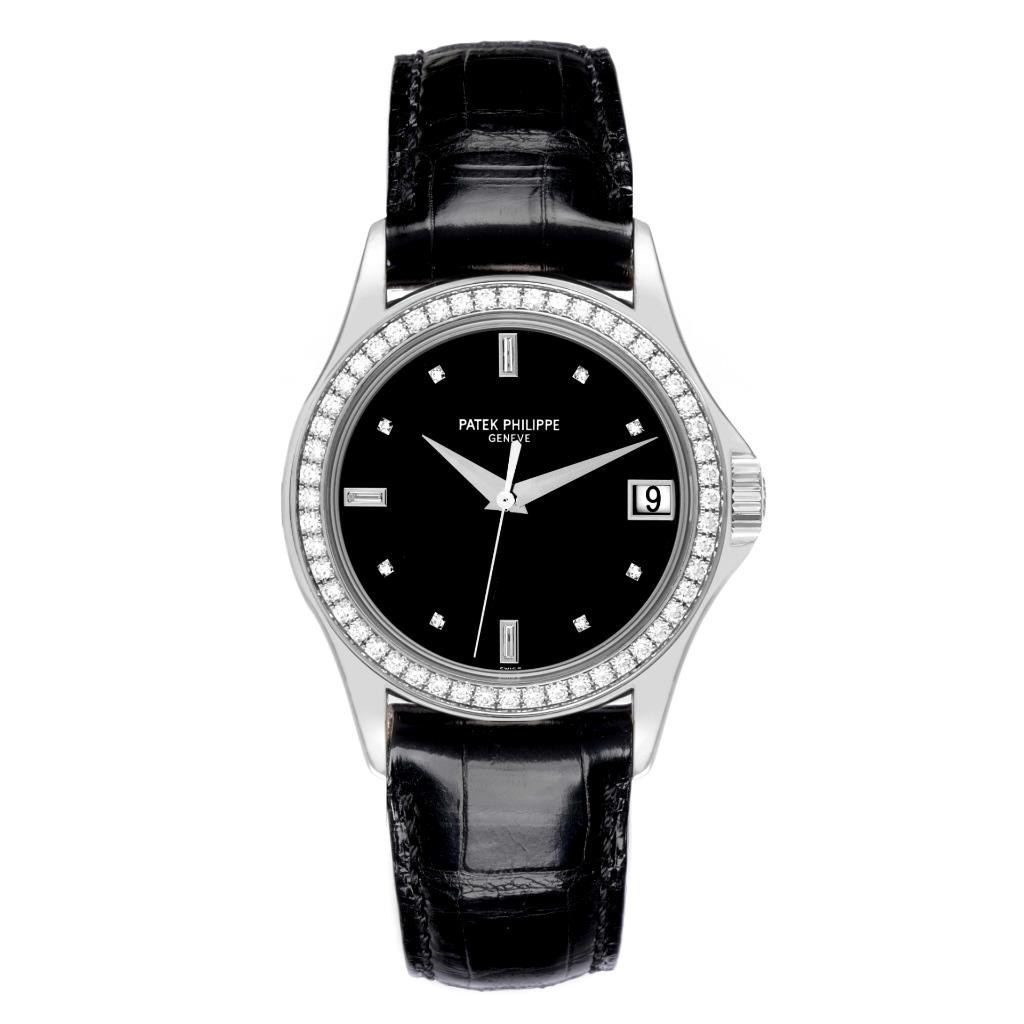 Patek Philippe Calatrava White Gold Diamond Mens Watch 4978 Box Papers Patek Philippe Calatrava White Gold Diamond Mens Watch 4978 Box Papers Click image to enlarge Description SwissWatchExpo 404-814-1814 Model number 5108G-010 Stock number 64993 Serial number 340xxxx Year 2010 MSRP $35,900.00 Gender Mens Movement Automatic self-winding movement. Jewels 29 Caliber 315 SC Case 18k white gold case 36.5 mm in diameter. Lugs and case side encrusted with original Patek Philippe factory diamonds. Transparent exhibition sapphire crystal case back. Patek Philippe logo on the crown. Crystal Scratch resistant s apphire crystal. Dial Black dial with original Patek Philippe factory diamond hour markers and white gold dauphine hands . Aperture for the date at 3 o'clock. Bezel 18k white gold Patek Philippe factory diamond bezel with 52 diamonds totaling 1.05 carats. Bracelet Black leather strap with 18K white gold Patek Philippe tang buckle. Condition Excellent condition. Authenticity 100% authentic. Engravings None Box & papers Patek Philippe box and papers. Working condition Timed to precision on witschi watch expert timing machine. Running strong and keeping the accurate time. Warranty The watch is covered by Swiss Watch Expo's one-year warranty on anything but abuse. Pictures All the photos are of the actual watch for sale. Payment - We ONLY accept payments in United States Dollars (USD). - Payments must be made within 5 days of winning the auction. Shipping Shipping Methods All shipments are sent fully insured, using the following carrier methods: * Domestic - UPS. * International - No international shipping available Terms of Sale 18 month Limited Warranty Swiss Watch Expo is honored to have the opportunity to serve you. That's why we stand by all of our products with a full 18 month limited warranty. If an item we sell you should fail as a result of a manufacturer's defect at any time during the first year and a half , we will repair or replace the item at absolutely no cost to you. Not covered by warranty: - Regular wear-and-tear from normal use. - External damage to the product. Any damages resulting from wear to the watch case, crystal/glass, watch bracelet, watch bezel, straps, screws, crown/stem, finishes, clasps/buckles, or any other physical damage to the watch. - defects caused by outside force or improper use. Consequential and incidental damages. - the loss of precious, semi-precious stones from settings. - Outside modifications and third party repair attempts of any kind will void the warranty. - Any damage if used under conditions which exceed the watch manufacturer?s water resistance guidelines. - Watches that are labeled as water resistant feature a screw down crown. The crown must be screwed down properly at all times to keep the watch casing watertight. Water damage is not covered under the warranty unless it is proven defective by the SwissWatchExpo Repair and service Center. Our 100% Money-Back Guarantee At Swiss Watch Expo, we understand that your purchase is a significant investment - one that you will pass down to future generations. That's why we're happy to give you a no-questions-asked money-back guarantee with no restocking fees. If you're not satisfied with your purchase, just let us know within 7 days after the purchase and we'll honor your return and issue a full refund, no questions asked. *Deductible amount for domestic shipping costs: $50 About Us This fine piece is a part of collection offered by Swiss Watch Expo , members of the National Association of Watch and Clock Collectors (NAWCC) and the International Watch and Jewelry Guild (IWJG). We are third generation jewelers who have been selling fine Swiss timepieces and elegant jewelry since 1982. We've built our reputation on quality, service and integrity, and we treat each customer with the utmost respect. We stand by all of our products with a generous warranty and guarantee, so you always know that when you bid with Swiss Watch Expo , you can can bid with confidence! About Swiss Watch Expo Thank you for the opportunity to serve you and welcome the Swiss Watch Expo ebay auction, where we proudly offer our collection of top quality Swiss timepieces and fine jewelry. We are third generation European trained master watchmakers and jewelry makers dealing in Fine Swiss watches, elegant gemstones and precious jewelry for nearly 30 years. Why You Should Choose Swiss Watch Expo Unlike many online resellers, at Swiss Watch Expo , we have built our business the old fashioned way - through our brick and mortar store in Atlanta, Georgia, providing our customers the very best products at an incredible value, while giving them the exemplary service they deserve. Now, as we serve the Ebay community, our commitment to the same philosophies holds true. We invite you to browse through our customer feedback to read about the experience others have had with us through Ebay. What Makes Swiss Watch Expo Products Better Than The Competition Every watch we sell has been completely inspected to ensure years of optimal functionality. What's more, there are never any middlemen involved in the process. From the time we purchase a watch, our experianced master watchmakers handle all repairs and restoration, making the watch as good as new. We've invested thousands into our state-of-the-art repair facility in order to carry out our commitment to quality. As for jewelry, every item is of the highest quality, using only the finest precious metals and gemstones available. When You Choose Swiss Watch Expo , You Have Nothing To Lose When you purchase an item from Swiss Watch Expo on Ebay, you have complete peace of mind. That's because we offer you a generous money-back guarantee without any restocking fee, no questions asked. Our philosophy is simple: By being committed to quality, service and value, we have satisfied customers who come back to us time and time again. Our entire staff is committed to providing you unparalleled quality and inc