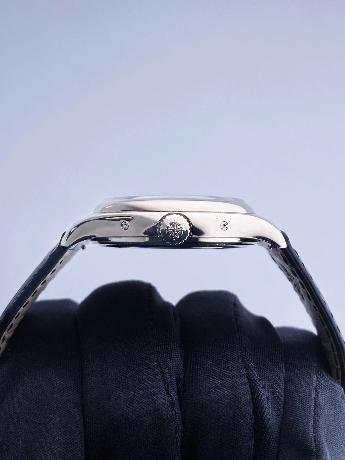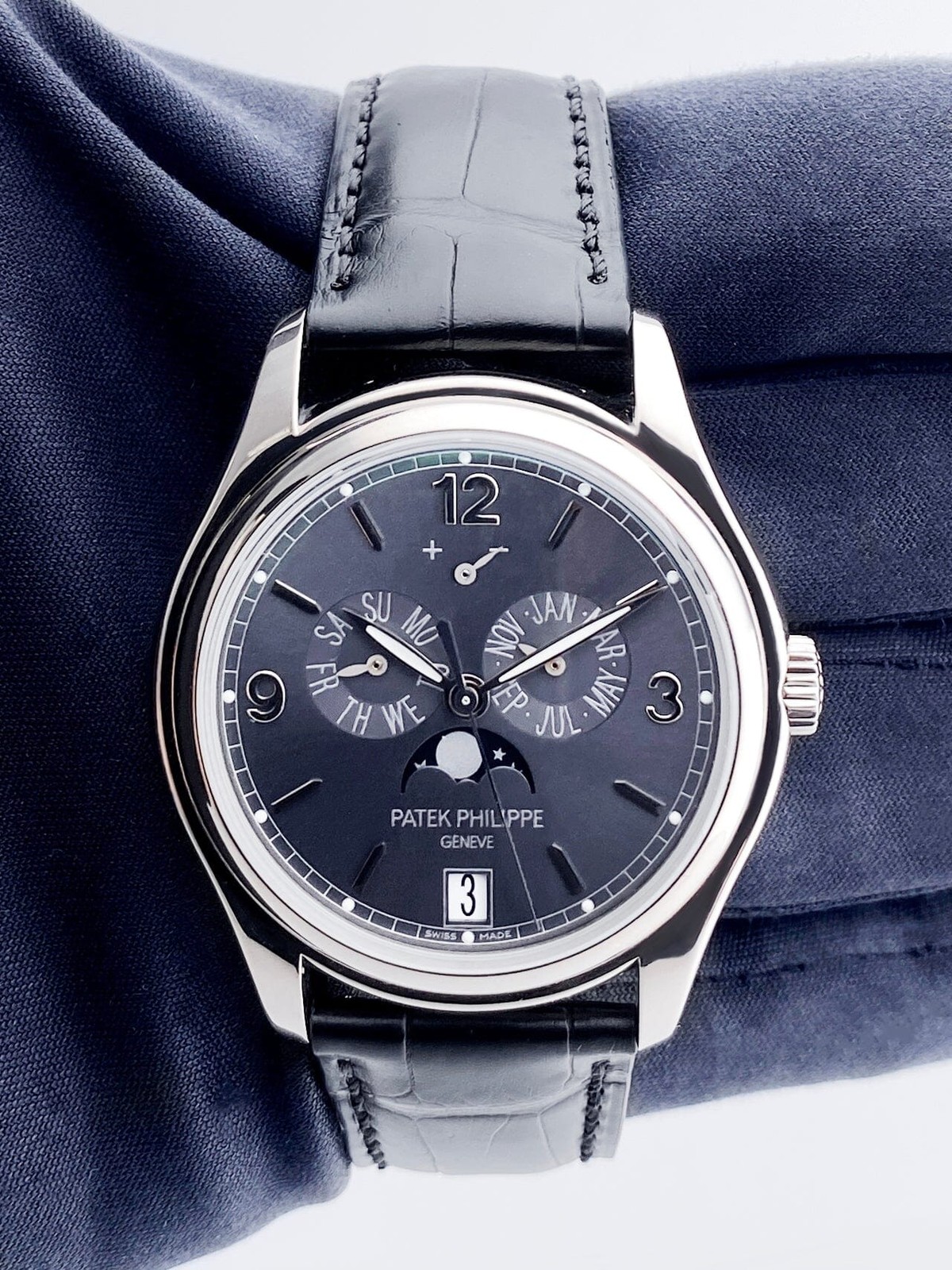 Patek Philippe Complications Automatic 39mm 18k White Gold Men's Watch 5146G-010 Patek Philippe Complications Automatic 39mm 18k White Gold Men's Watch 5146G-010 Description 18kt white gold case with a black (alligator) leather strap. Fixed 18kt white gold bezel. Slate gray dial with silver-tone leaf-style shape hands and index hour markers. Arabic numerals appear at the 3, 9 and 12 o'clock positions. Minute markers around the outer rim. Dial Type: Analog. Luminescent hands and markers. Date display at the 6 o'clock position. Four displayings showing: day of the week, month, moon-phase and power reserve indicator. Patek Philippe calibre 324 S IRM QA LU automatic movement, based upon Patek Philippe 324 S C, containing 36 Jewels, composed of 355 parts, bitting at 28800 vph, and has a power reserve of approximately 45 hours. Scratch resistant sapphire crystal. Transparent case back. Round case shape, case size: 39 mm. Deployment with push button release clasp. Water resistant at 30 meters / 100 feet. Functions: annual calendar, moon phase, month, date, day, hour, minute, second, power reserve indicator. Additional Info: 36 jewels. Complications Series. Luxury watch style. Watch label: Swiss Made. Patek Philippe Complications Automatic Slate Grey Dial Men's Annual Calendar Watch 5146G-010. Product Details General Case Case Material 18kt White Gold Case Shape Round Case Back Transparent Band Band Material (Alligator) Leather Band Type Strap Band Color Black Clasp Deployment with Push Button Release Dial Dial Color Slate Gray Type Analog Crystal Scratch Resistant Sapphire Hands Silver-tone Leaf-style shape Dial Markers Index Second Markers Arabic Numerals appear at the 3, 9 and 12 o'clock positions. Minute Markers around the outer rim Sub Dials Four - Day of the Week, Month, Moon-phase and Power Reserve Indicator Luminiscence Hands and Markers Bezel Fixed Bezel Material 18kt White Gold Information Brand Patek Philippe Collection Name Complications Gender Mens Model 5146G-010 Watch Label Swiss Made Movement Automatic Engine Patek Philippe Calibre 324 S IRM QA LU Power Reserve Min. 35 hours - max. 45 hours Features Water Resistance 30 meters / 100 feet Calendar Date display at the 6 o'clock position Functions Annual Calendar, Moon Phase, Month, Date, Day, Hour, Minute, Second, Power Reserve Indicator Watch Features Alligator Leather, Analog, Annual Calendar, Power Reserve Indicator, Month, Gold, Leather, Moon Phase B219609 ETTUEYW Showcase your items with Auctiva's Listing Templates! THE simple solution for eBay sellers. Track Page Views With Auctiva's Counter