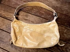 Patent leather, butterscotch colored handbag, fully lined in satin fabric with 3 interior pockets (one with a zippered closure) and 2 outside zippered pockets. 14" wide x 8" tall and 1.75" wide x 17" long strap.