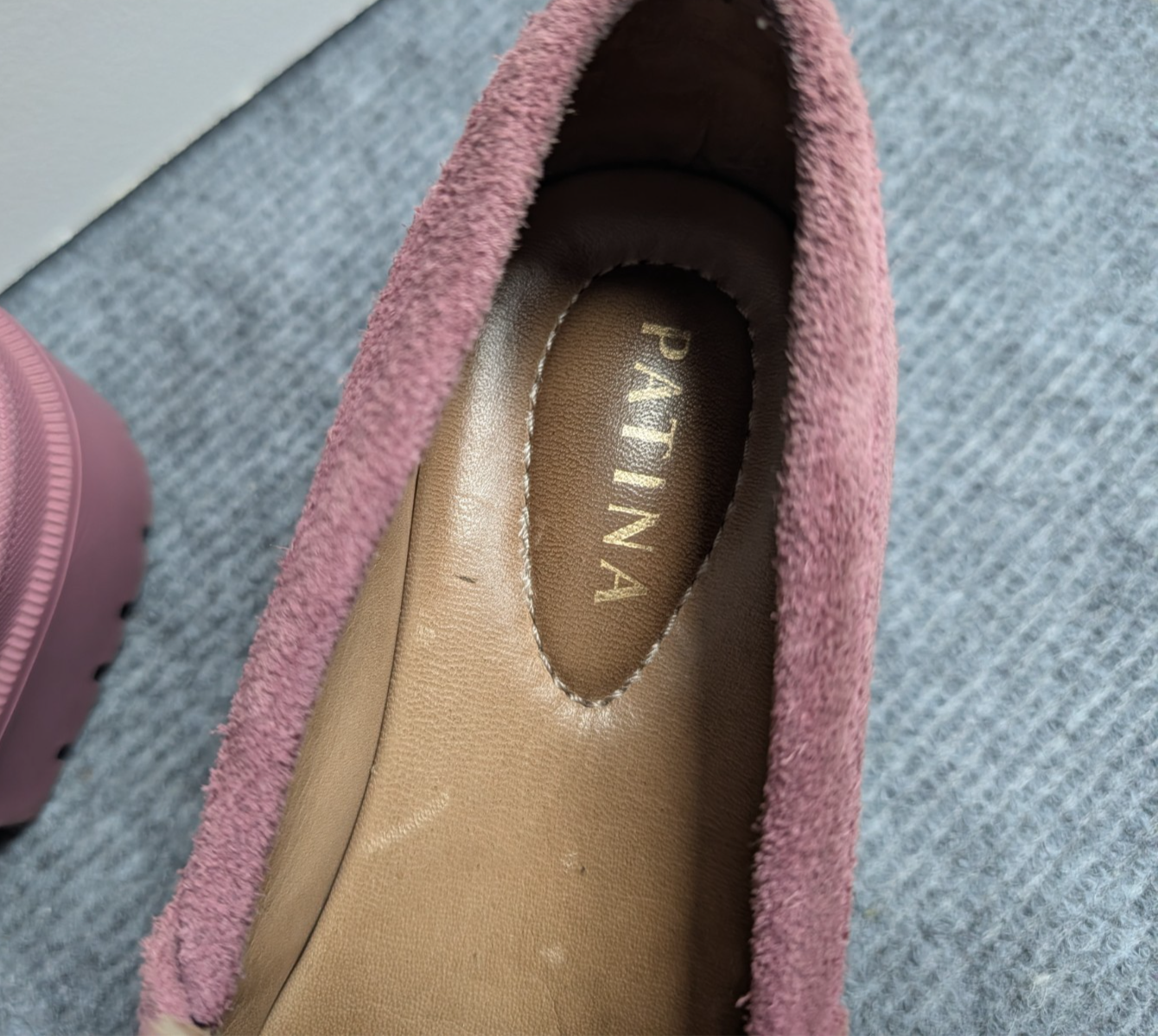 Brand: Patina Style: Loafers Department: Women US Shoe Size: 7 EU Shoe Size: 37 UK Shoe Size: 5 Color: Pink Upper Material: Suede Leather Pattern: Solid Type: Casual Closure: Slip-On Features: Chunky Rubber Sole, Penny Strap, Cushioned Insole, Durable Stitching Insole Material: Leather Outsole Material: Rubber Lining Material: Leather Condition: Pre-owned Made In: Mexico Occasion: Everyday, Work, Travel, Streetwear