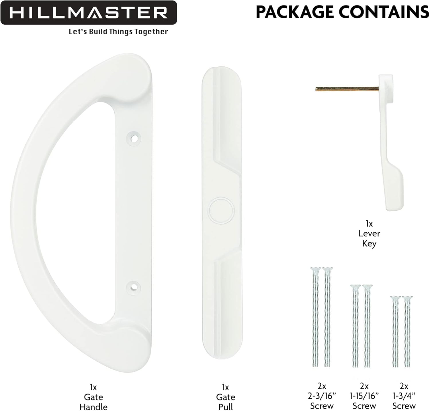 【Economical Replacement Door Handles】Don't spend too much money to replace the whole door! HILLMASTER durable universal sliding patio door handle set can complete your patio sliding door perfectly, die-cast metal white finish design fit great with any color patio glass door. 【NON-KEYED & NON-HANDED】The exterior pull comes non-keyed, sliding glass door handle suitable for mortise-style doors and features an offset thumb-turn lever, design for right or left handed. Note: This handle is not convertible with key function now. 【Package Includes】Interior Handle, Exterior Pull, Thumb Latch Lever, 6x Screws with 3 different sizes: Large 2-5/16", Medium1-15/16”, Small 1-3/4”. Note: please choose the right length screws according door thickness. 【Quick Installation】Glass Sliding Door handles set fits 1-1/4” to 1-3/4" thick door and 3-15/16" hole spacing, Standard reversible, only works with mortise hook style door handles, Note: Please refer to the dimensional details carefully before purchasing. 【Professional Guarantee】We are specialized in producing various hardware fittings more than 15 years, please go find all kinds of home hardware fittings you need in HILLMASTER store! Please feel free to contact us if there is any problem. We are committed to providing the professional products and the caring service for every consumers. Product Description Replacement Door Hadle Set When your door handle is broken, old or unsightly, don’t replace the door entirely, just get a new sliding patio door handle set. Multi-purpose Handle Hardware Perfect for screen door, storm door, sliding door, glass door, patio door and so on. Cost effective to replace old door handles. Easy and Quick Installation Just need a screwdriver and another helping hand to hold the latch in place, basic screwdriver is the only thing you really need.