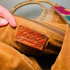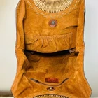 Round wooden handles(one on the inside is slightly scuffed) Floral print leather bag Soft spacious inside with pockets Outside pocket Barely noticeable cut on outside back (shown in photo)