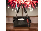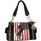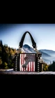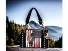 American Flag Horse Purse Patriotic USA Western Handbag Country Style Women Shoulder Bag Red White Blue Stars and Stripes Western Horse Handbag Crafted from the highest quality soft imitation leather Single compartment fabric lined interior divided with a medium zippered pocket, front wall that has 2 open pouch pockets and a zippered wall pocket on inside rear; effortless glide zip top closure One zippered pocket on the back which serves as a convenient way to effortlessly retrieve essential items; open pocket that can fit a 5 inch smartphone Eye catching double chain shoulder handles; two side pockets with snap closure adorned with white stars offer access to items you need quickly and easily; metal feet on bottom for protection, durability and balance Measures 13 inches long X 9 inches tall x 5 inches wide with 10 inch strap drop Celebrate your love for country and horses with this patriotic handbag showcasing a striking black majestic horse against a vibrant backdrop of red, white and blue stars and stripes reminiscent of the American flag. Crafted from the highest quality soft supple imitation leather, this purse features intricate black lacing with dazzling stand-out studded stars on the side of the bag and on the USA flag and includes detachable key ring/purse charm on the front. Spacious horse purse is designed to keep you organized with its single compartment fabric lined interior divided with a medium zippered pocket, front wall that has 2 open pouch pockets and a zippered wall pocket on inside rear. Secure your possessions with its effortless glide zip top closure. One zippered pocket on the back (10 inches long x 6.5 inches tall) which serves as a convenient way to effortlessly retrieve essential items such as your car keys, tickets, earphones, or sunglasses and a white contrasting open pocket that can fit 5 inch smartphone. Eye catching double chain handles that rest comfortably on the shoulder or can be carried by hand. Two side pockets with magnetic snap closure adorned with white stars can be used to store your tissues, lipstick or any items you need to access quickly and easily. Metal feet on the bottom to keep the bag clean, protected and stable. Western style shoulder bag measures 13 inches long X 9 inches tall x 5 inches wide with 10 inch strap drop. Suitable for work, shopping, vacations, evenings out with friends, holidays, parades or fests, or for cowgirls just to stand out and show off your American pride.