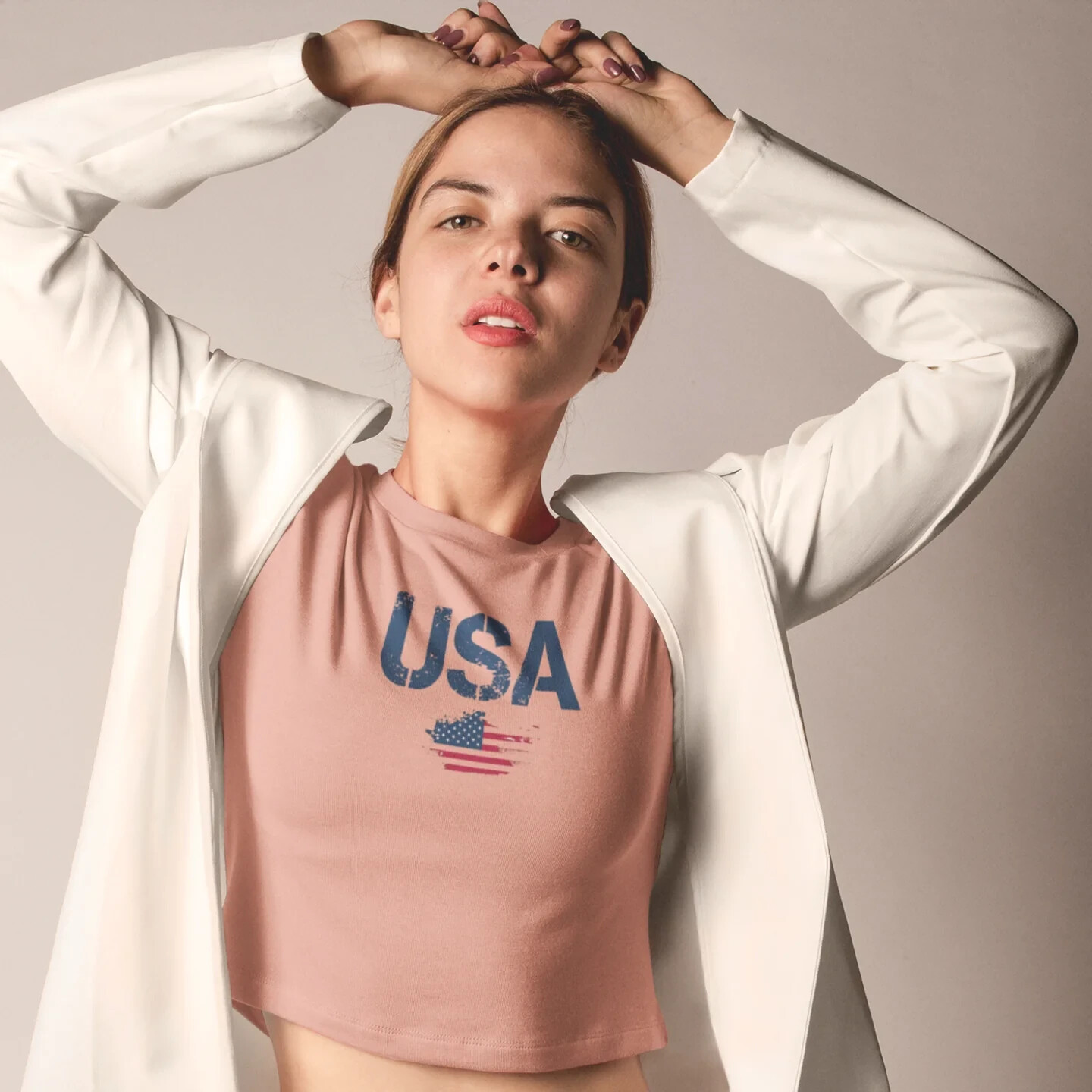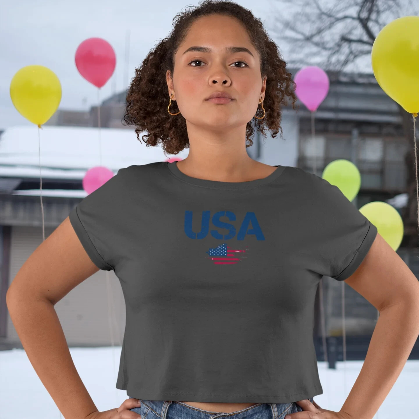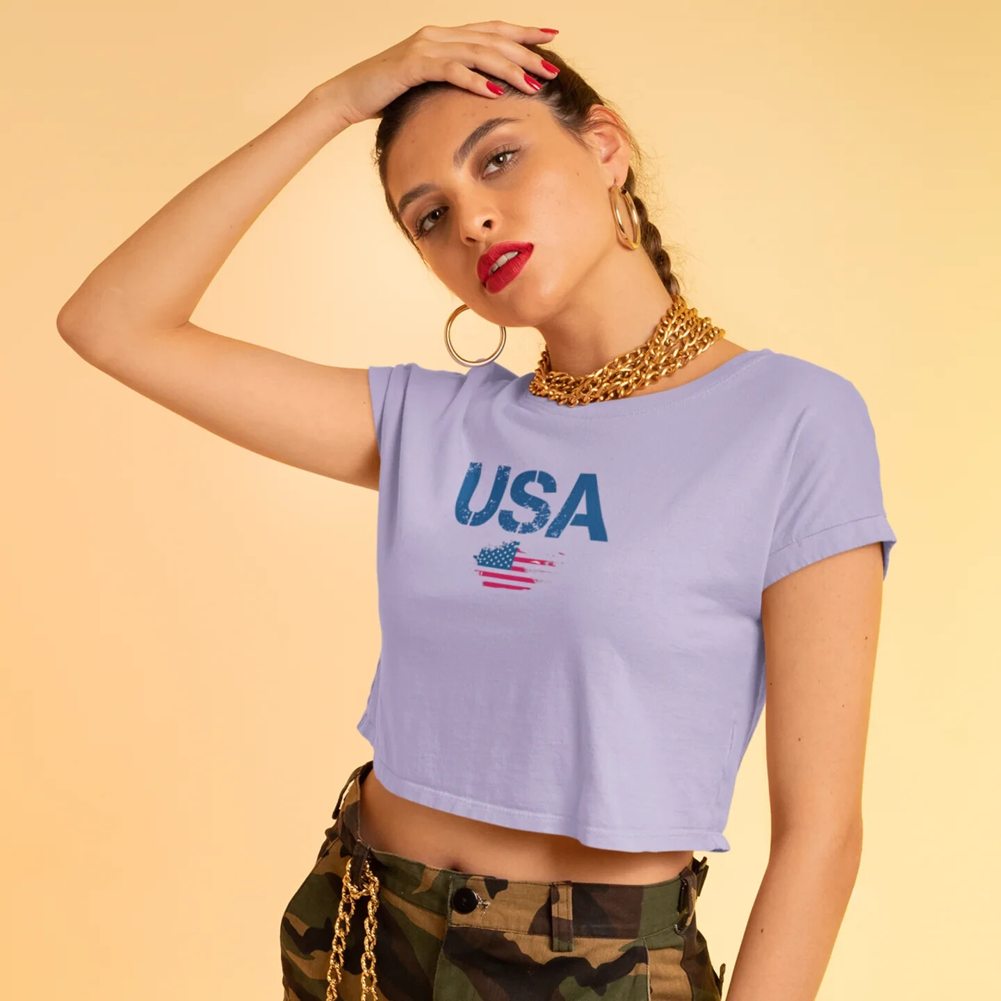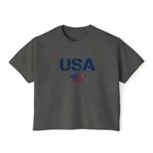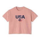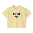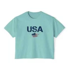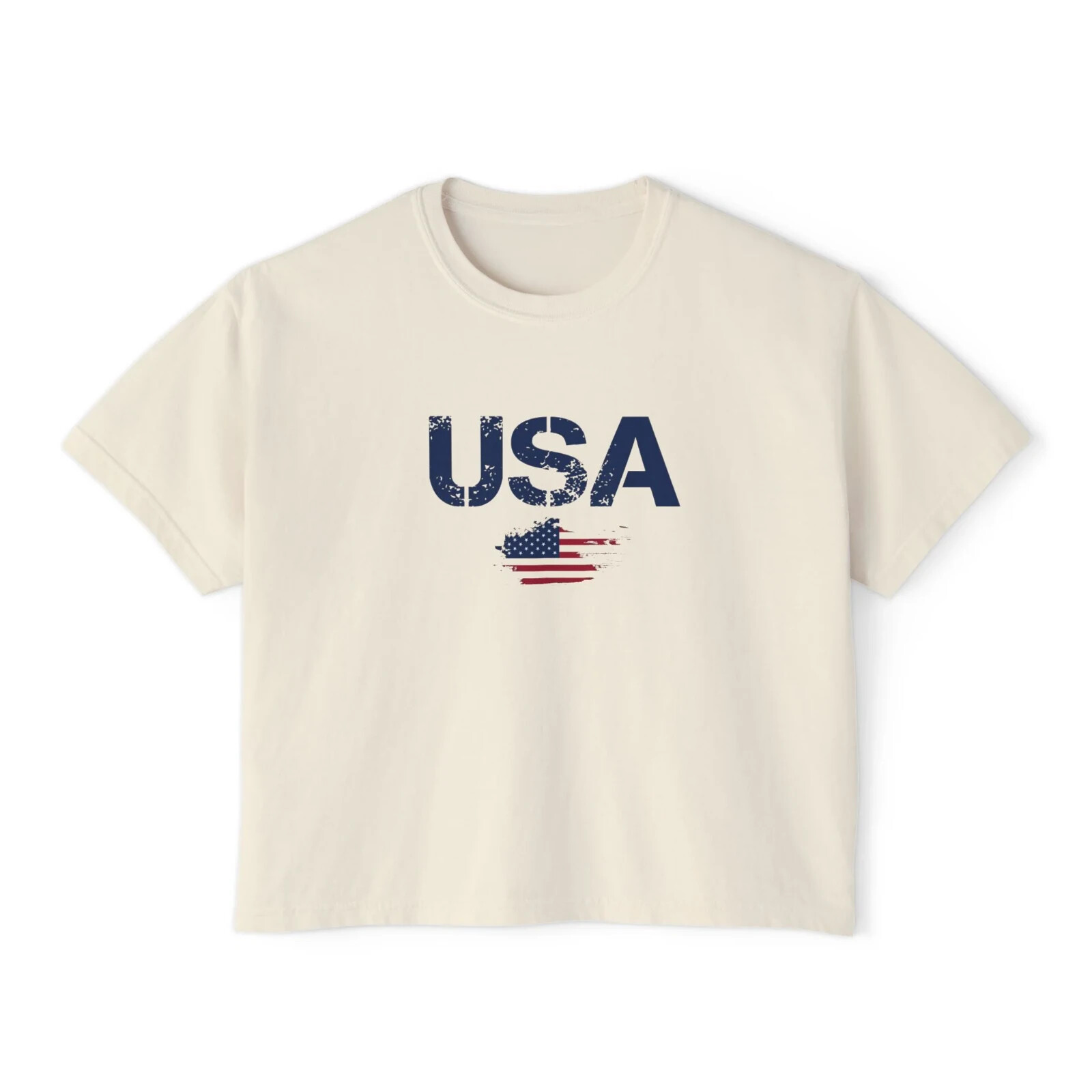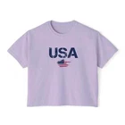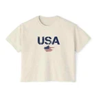 Description Introducing our Women USA Flag Printed Boxy Fit Cropped Tee, the perfect blend of style and comfort for the modern woman. This eye-catching tee features a bold and vibrant USA flag print that adds a touch of patriotic flair to any wardrobe. Designed with a boxy fit, it offers a relaxed silhouette that flatters all body types while providing ease of movement. The cropped length pairs effortlessly with high-waisted jeans or shorts, making it a versatile choice for casual outings or laid-back weekends. Made from soft, breathable fabric, this short-sleeve tee ensures all-day comfort, keeping you cool and stylish. Whether you're celebrating a national holiday or simply embracing your love for the USA, this cropped tee is a must-have addition to your casual collection. Overview: This women's oversized boxy t-shirt brings ample comfort and a laidback style that feels right at home on any occasion. With its 100% ring-spun cotton fabric, it feels soft, while the boxy fit with the slightly cropped, seamless body adds that signature oversized look. This shirt is made with ethically and sustainably sourced cotton while the OEKO TEX-certified dyes mean all your prints come alive with eco-friendly, vibrant colors that last and are salt-free. Pigment dyes provide a vintage look that will remain for the life of the garment. Fabric: 100% ring-spun cotton Heavy fabric (6.1 oz/yd² (206.8 g/m²)) Fit: The shirt has a boxy fit and has a slightly cropped seamless body. Twill tape covers the shoulder and neck seams to stabilize the back of the shirt and prevent stretching.